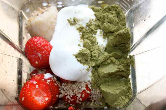 I added that to strawberries, a frozen banana, almond milk, natural probiotic yogurt and some sesame seeds for more protein and essential fat.