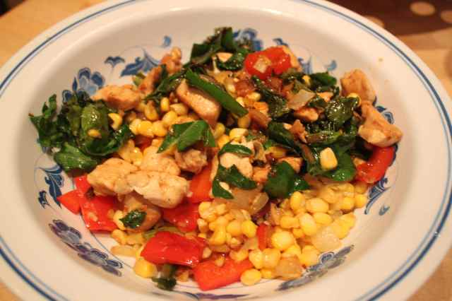 red pepper, onion, sweetcorn and chicken. I cooked it with fresh ginger and some chill sauce I bought in a farm shop.