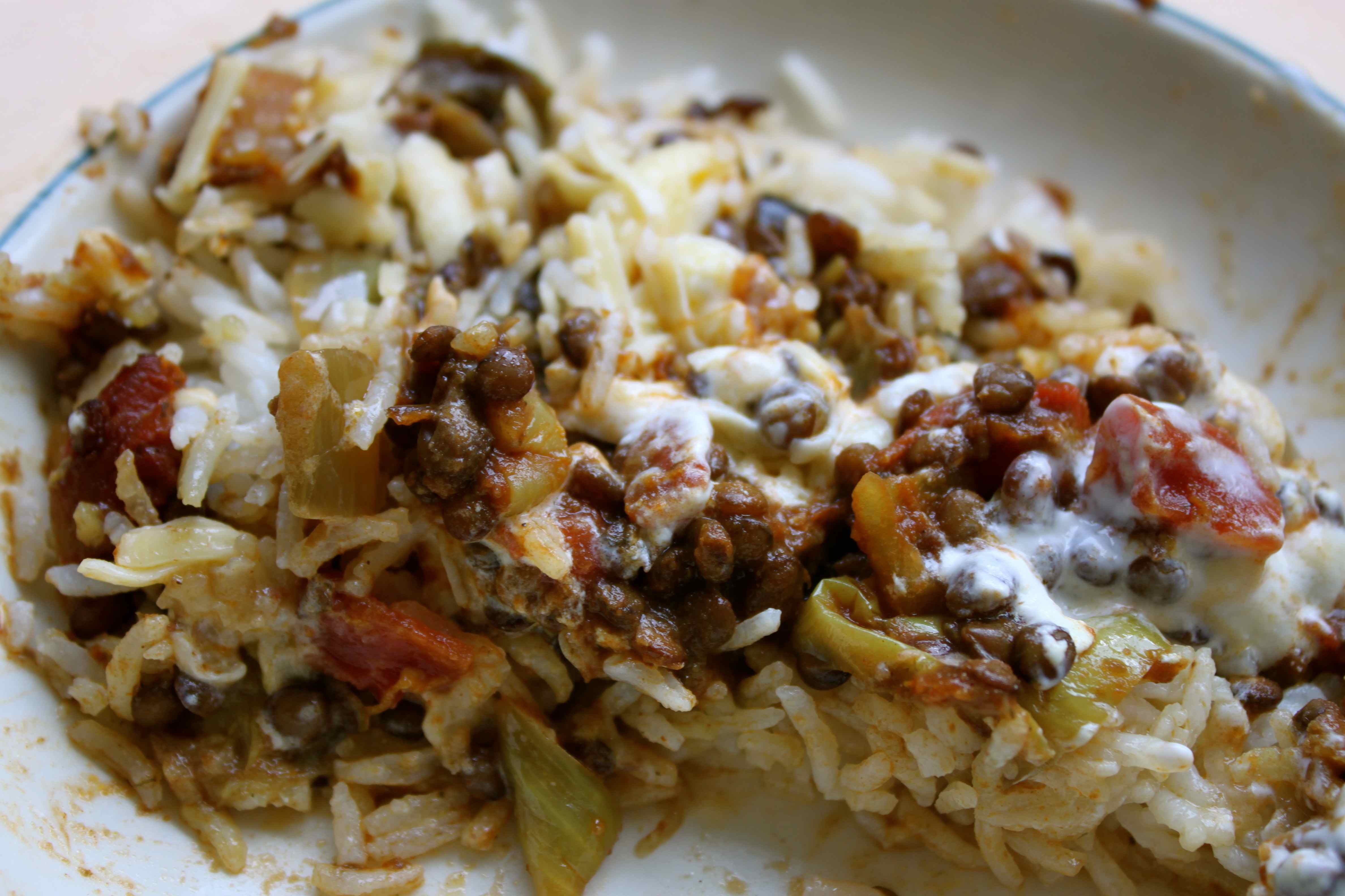 Lunch was reheated lentil and aubergine bake with rice, yogurt and cheese. It reheated really well. Too well actually because I ate most of it before remembering to take a photo! I will definitely be making this again, it really was very good.
