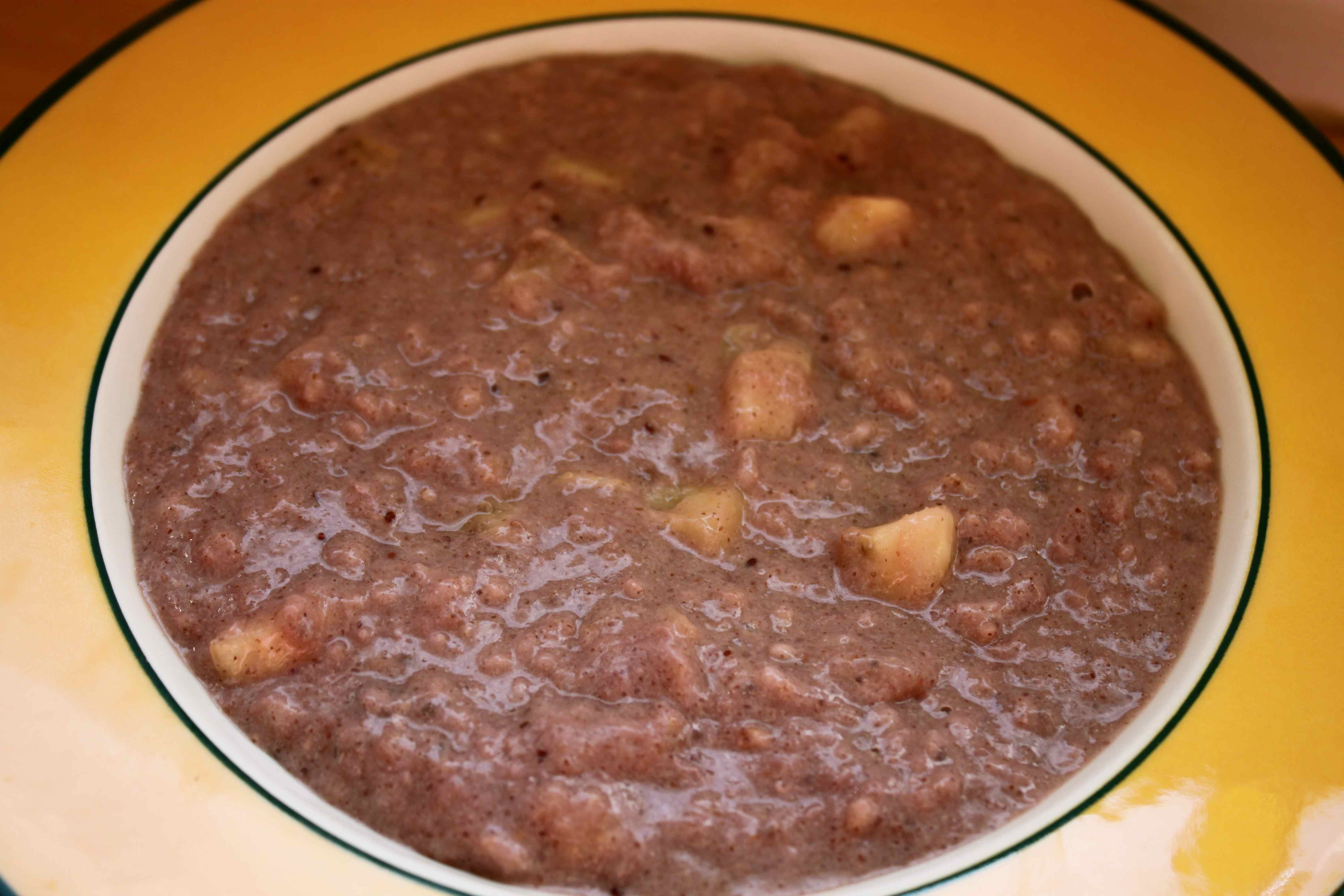 This looks weird but it was quite tasty. I had some left over smoothie from yesterday and I used it to make porridge with this morning. The chunks are banana to sweeten it as it was a bit sharp.