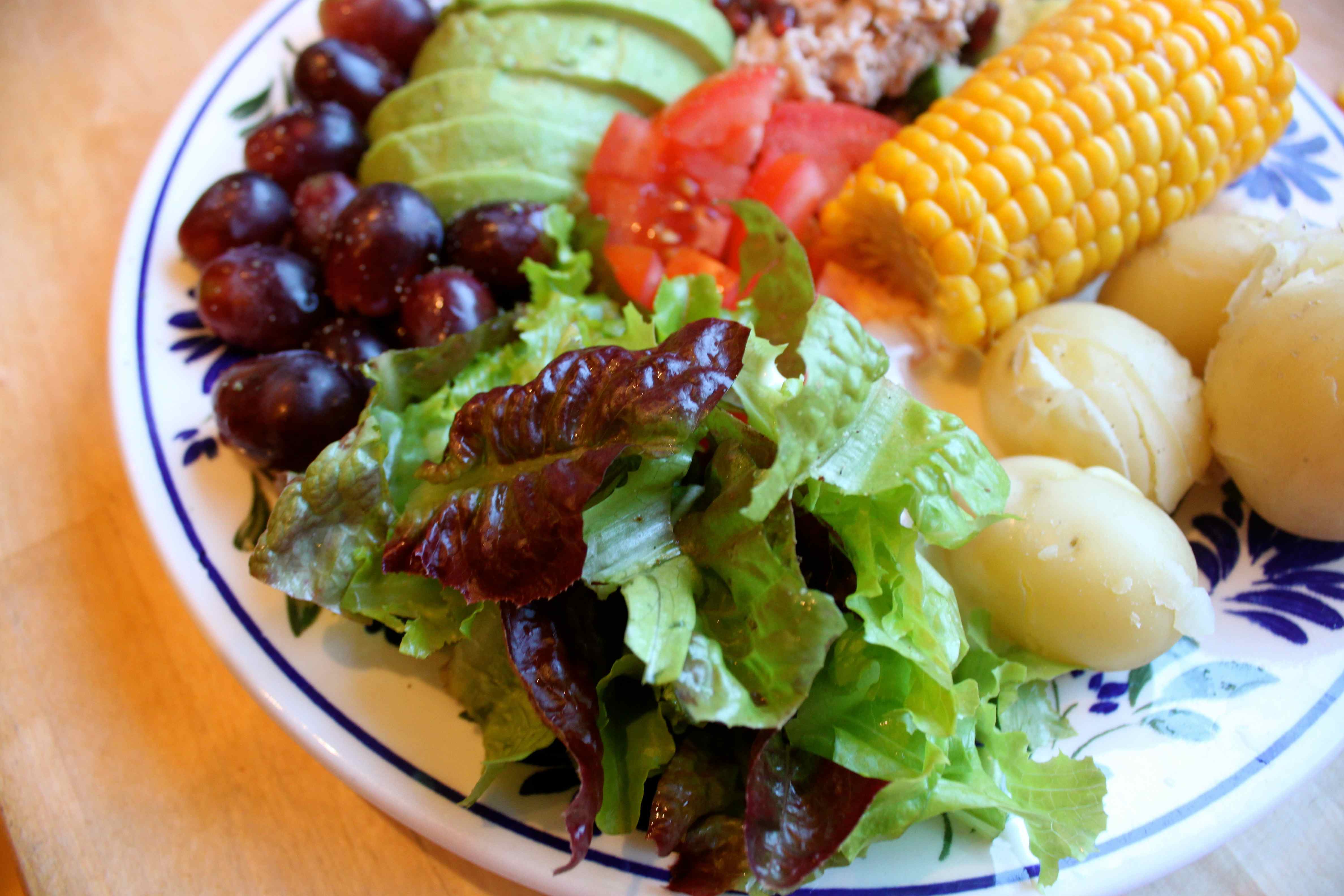 I asked him to choose food that was different colours, tastes and textures and he did a great job. On our colourful plates we had tuna in mayonnaise, pomegranate, avocado, red grapes,lettuce, tomato, cucumber, home grown new potatoes (served with butter and salad cream) and half a corn on the cob each. The potatoes were excellent. They have so much more flavour when they have just been dug up and the texture was lovely – firm and dense, not watery like some I have had recently.