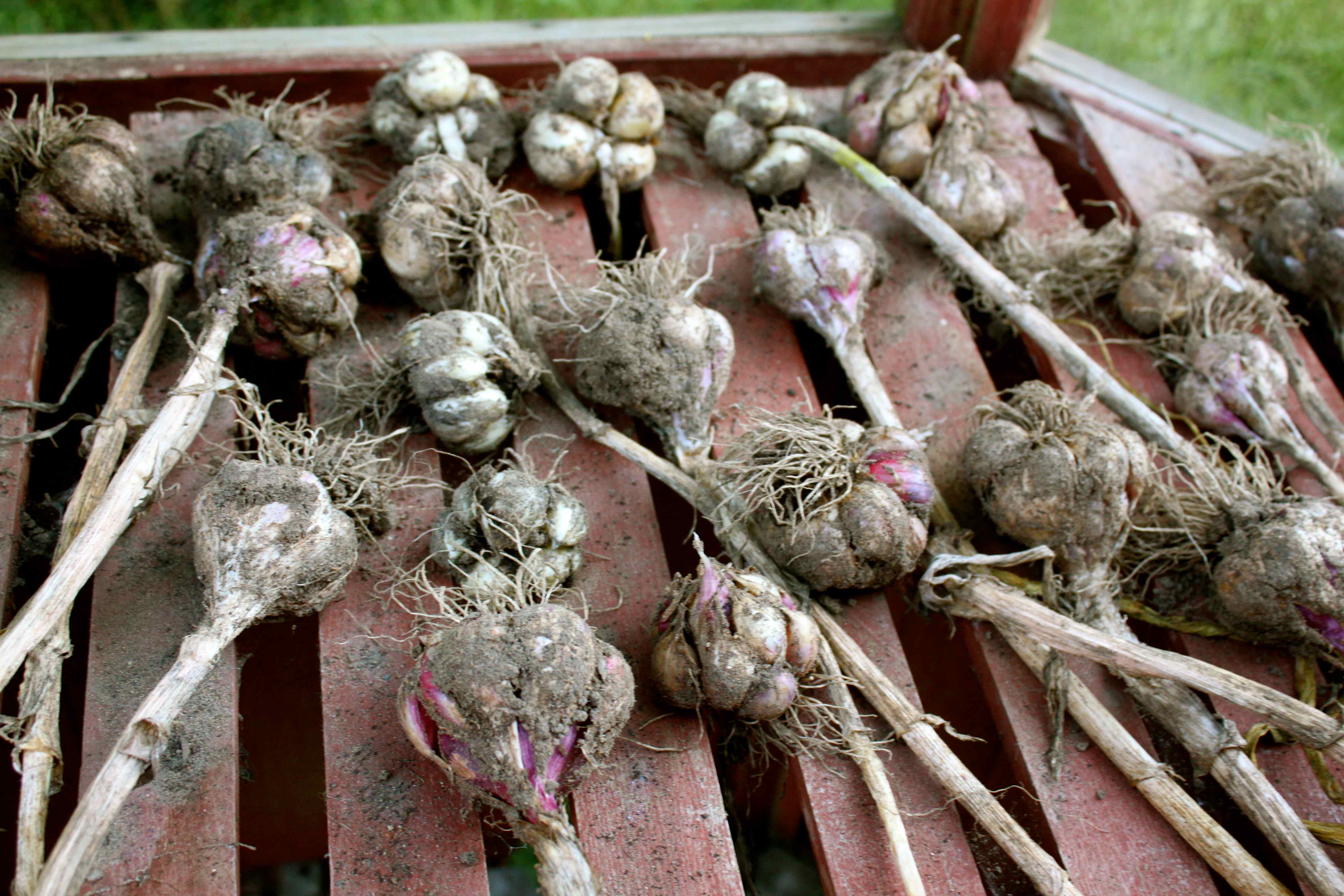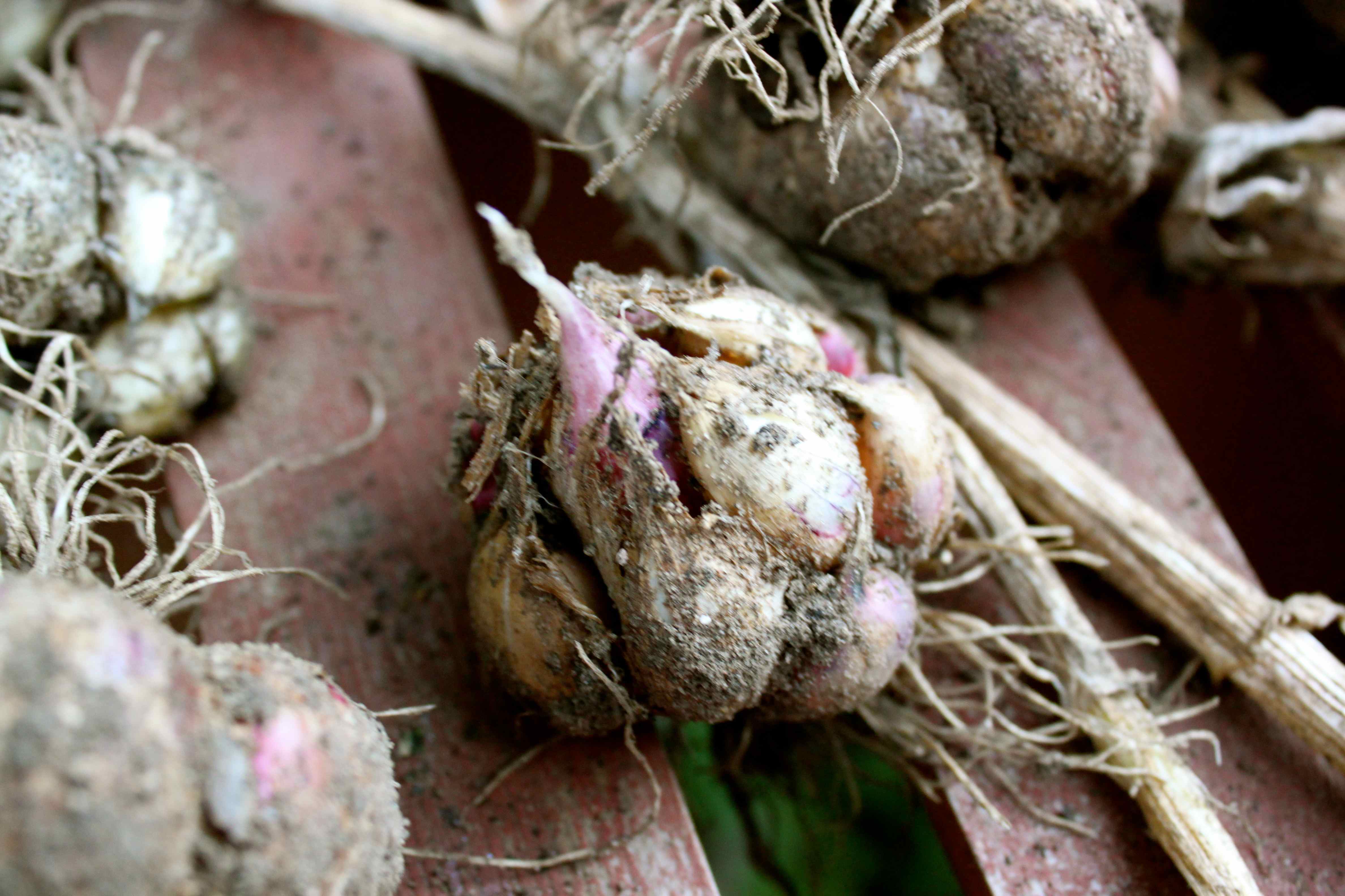 Yes, garlic. I am so pleased this grew in my garden. Real garlic bulbs. I was so excited! Particularly because they looked like they had rotted so I wasn’t expecting any of them to have grown. Adrian laid them out in the greenhouse to dry out and tomorrow I will snip off the roots and scrape off the mud and then store them :-).