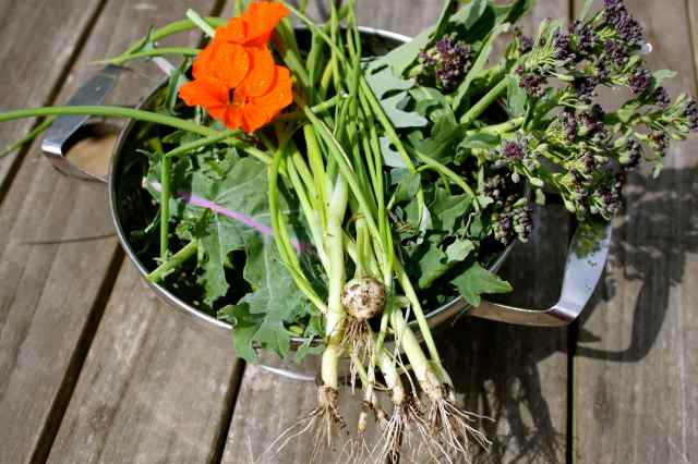 For lunch I went and picked green beans, broccoli, 3 types of kale and spring onions plus nasturtiums.