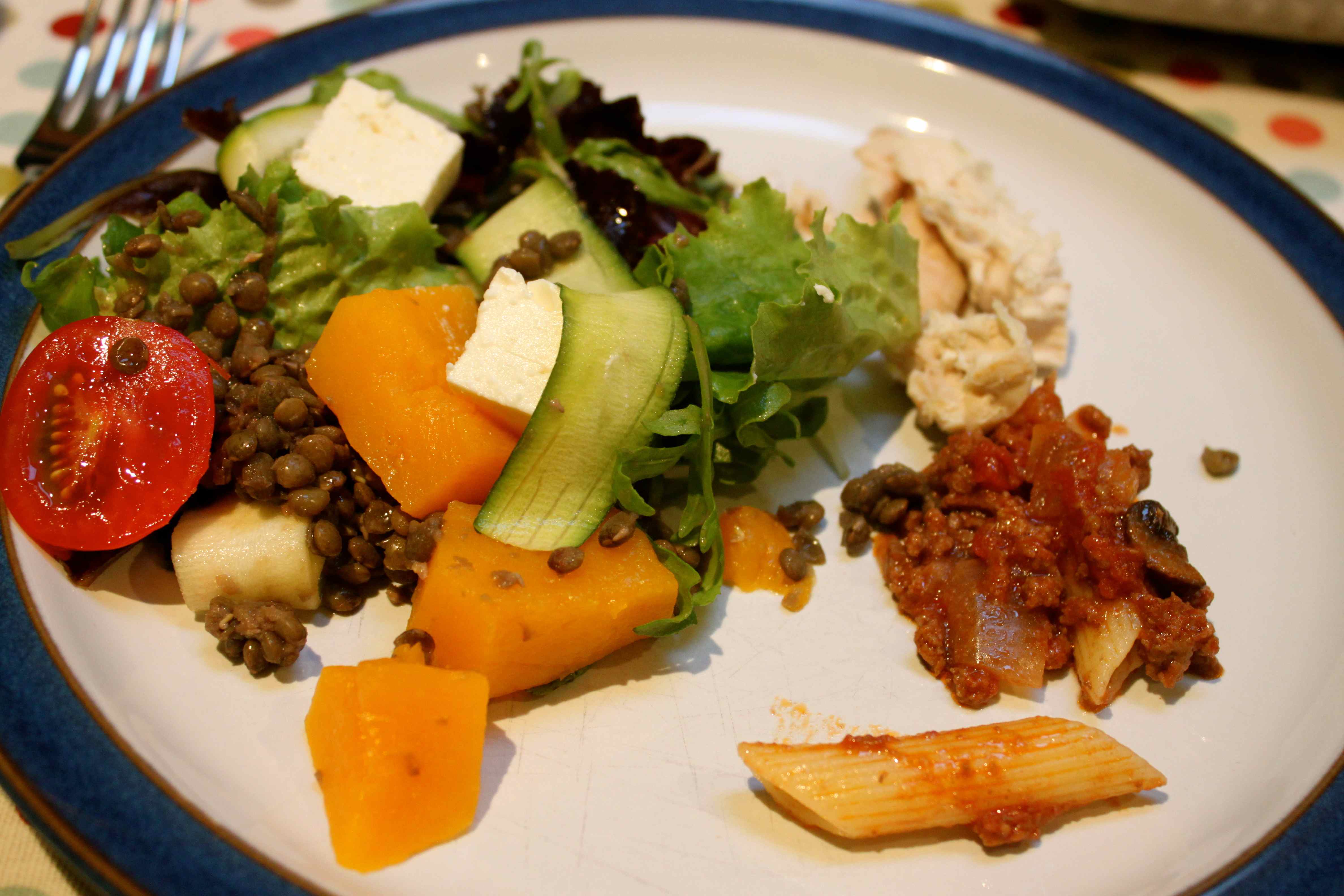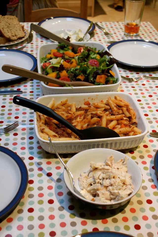Helen made a lovely Supersalad, which had squash, courgettes, lettuce, tomatoes, green lentils and Feta. Plus we had roast chicken and penne and bolognese sauce. It was delicious.