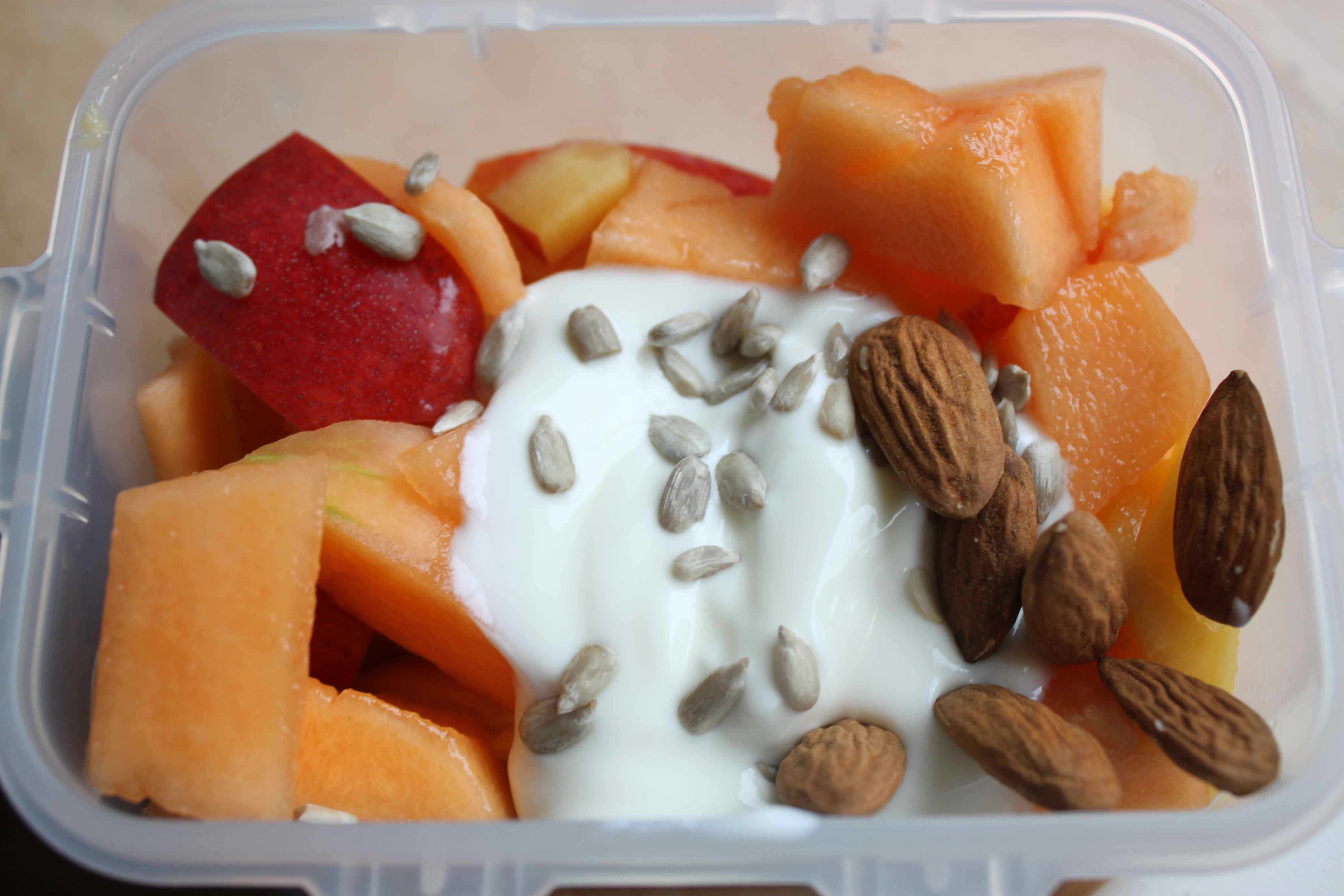 But before Thursday was Wednesday and I was pretty good. Healthy breakfast of nectarine, melon, yogurt, sunflower seeds and almonds.