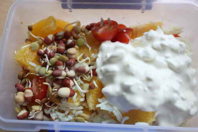 Yummy lunch of salad, orange, rice and cottage cheese with mixed sprouts.