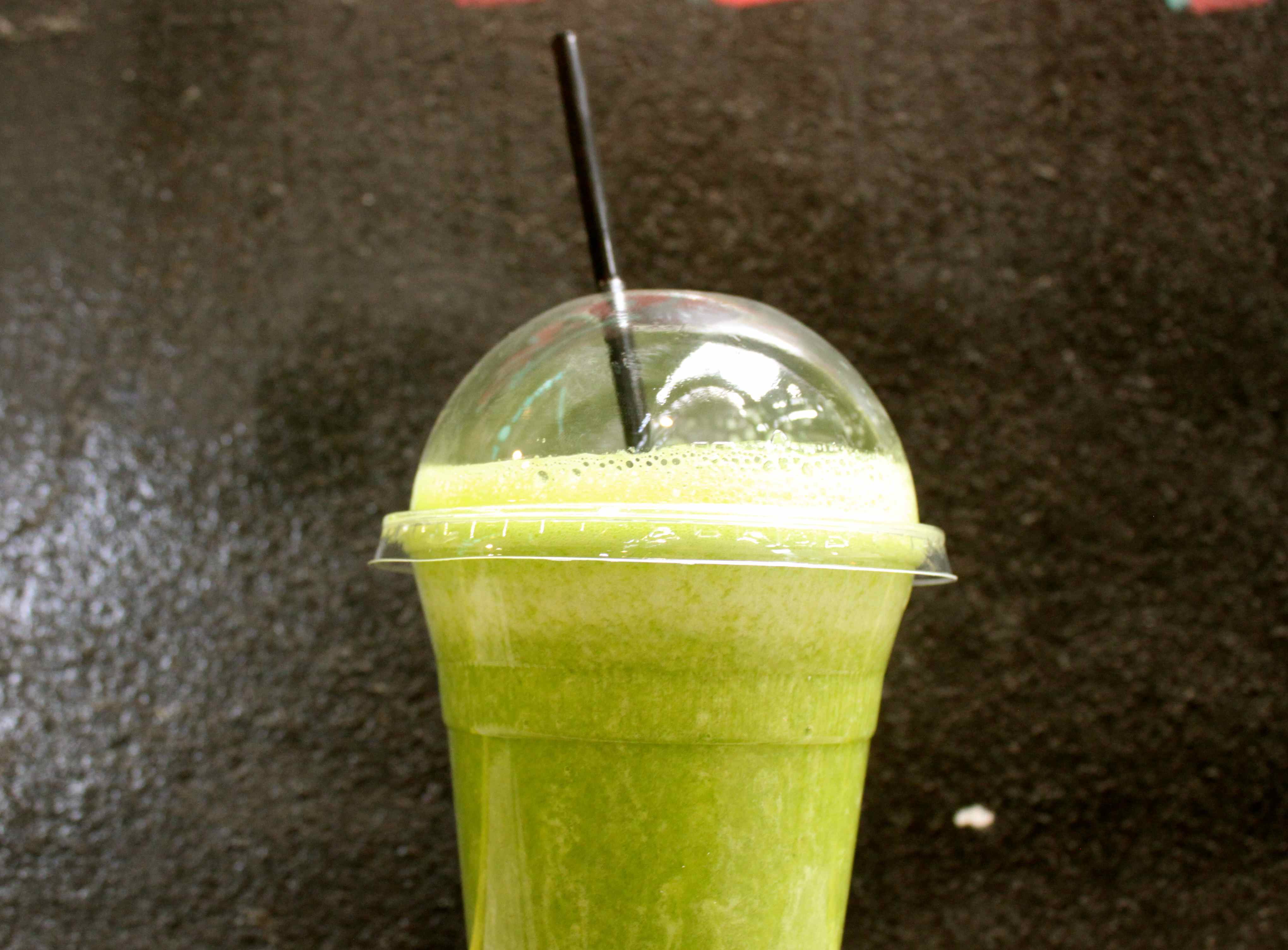 In a wheatgrass smoothie, which had wheatgrass with orange, lime, apple and banana.