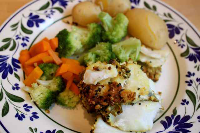 I served this with potatoes and carrots from the garden and broccoli. Broccoli from the supermarket thanks to the caterpillars! This variety of potatoes is ‘Shirley’ and they are a lovely firm consistency with excellent flavour. I confess I did eat my potatoes with butter and salad cream.