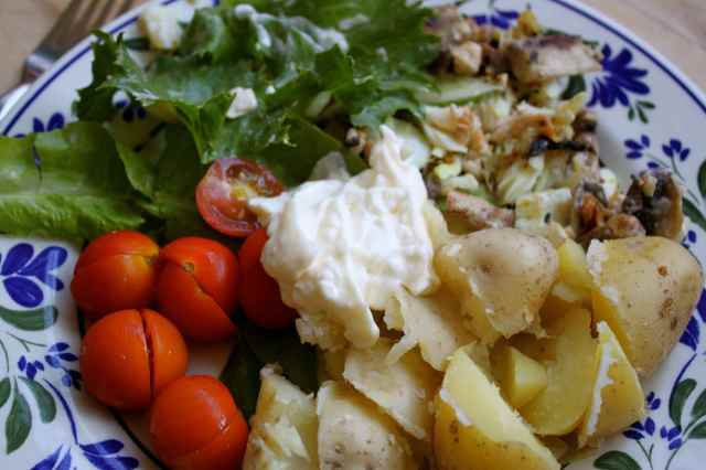 a salad of leftover cod with home grown potatoes, lettuce and tomatoes