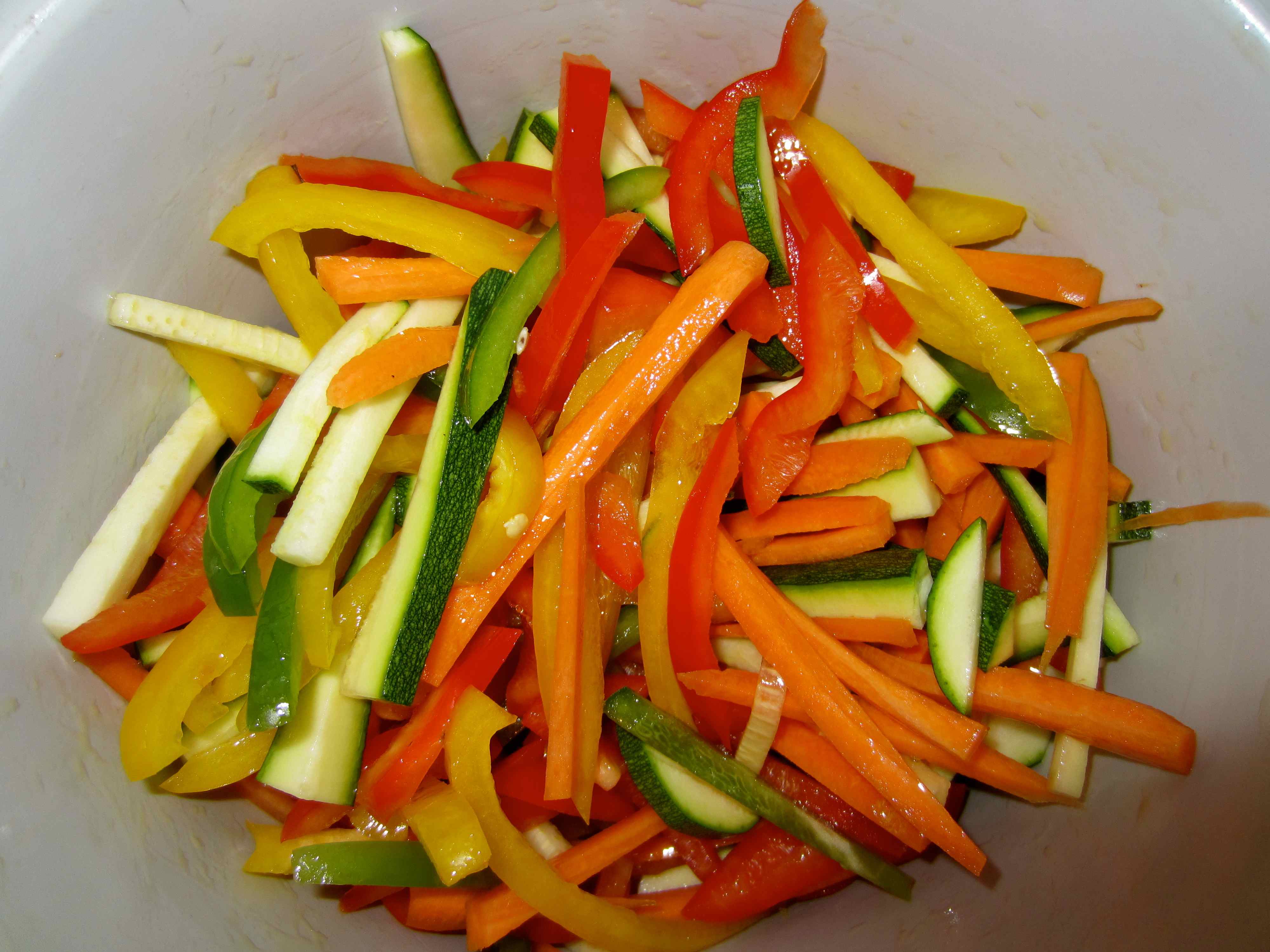 This was served with courgette, carrots, red, yellow and green pepper which was cut in to matchsticks and stir fried lightly.