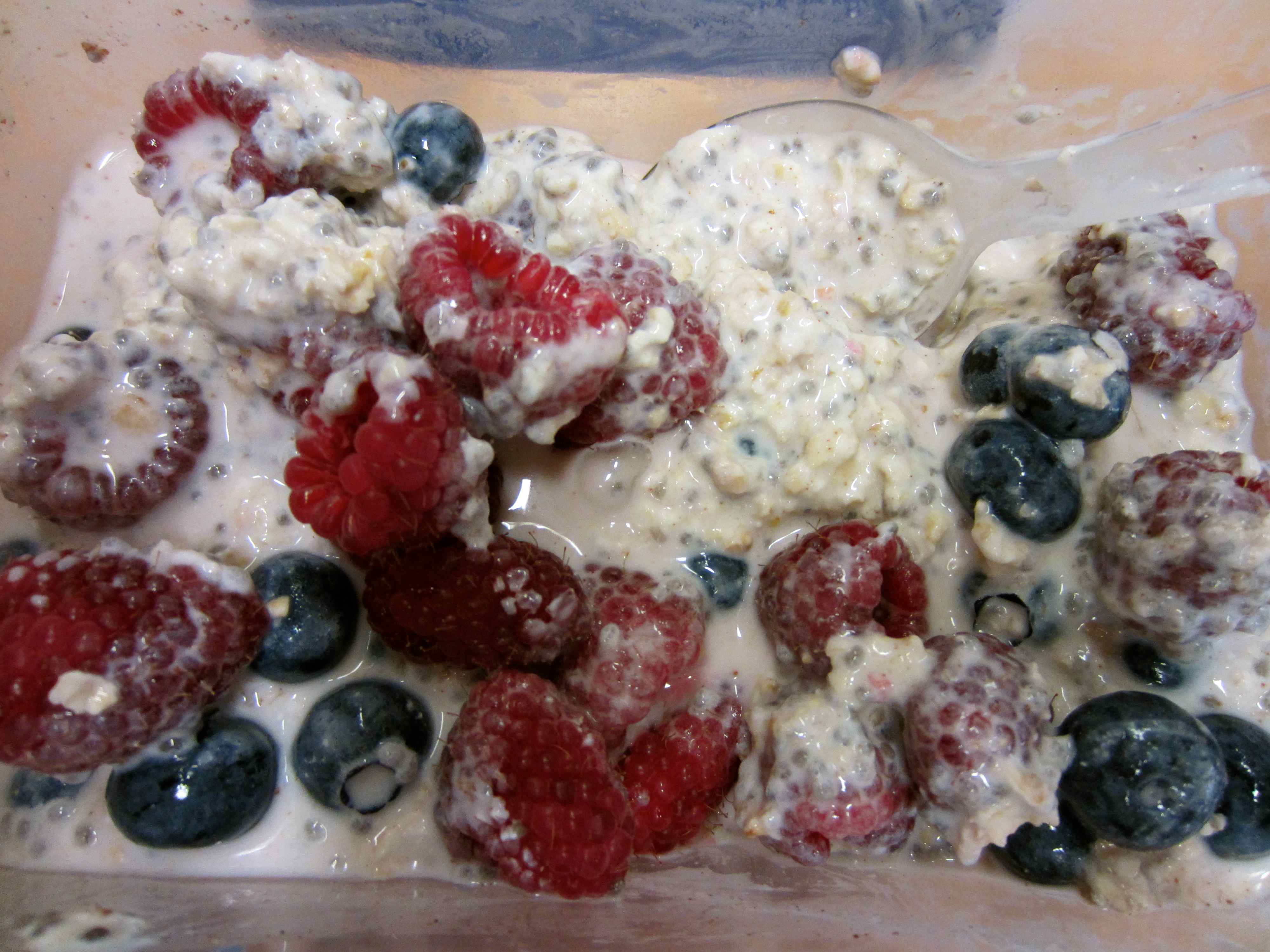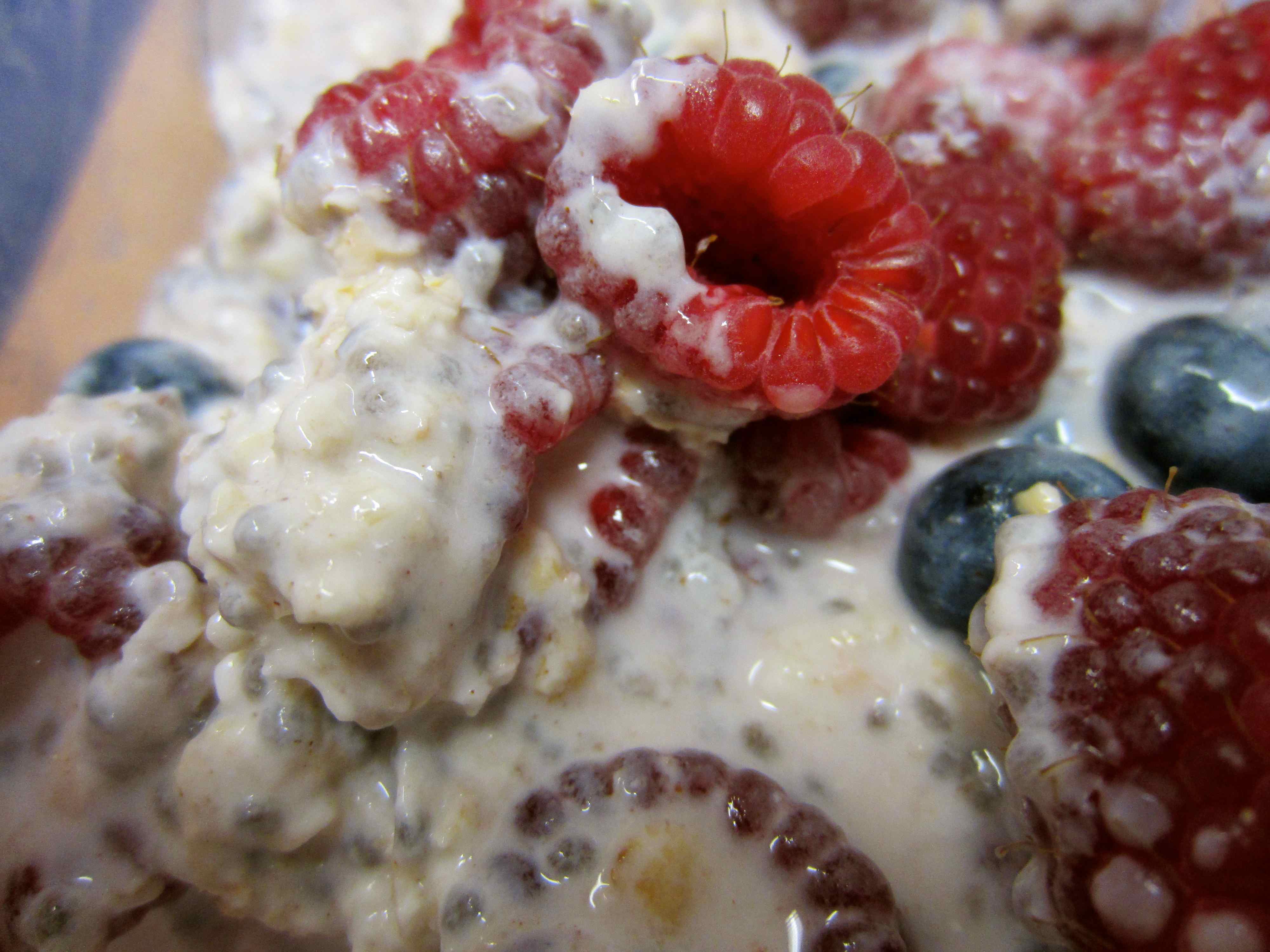 The night before I put 1/2 cup of oats in a container with 1/2 cup of almond milk, 1/2 cup of natural yogurt. 1 tbsp chia seeds, 1/2 tsp cinnamon and raspberries and blueberries. Yum.