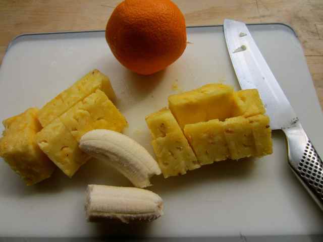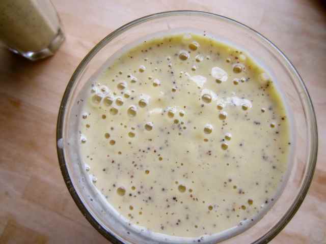 A smoothie, made with pineapple, orange, banana, soya yogurt, poppy seeds, maca and lucuma powder.
