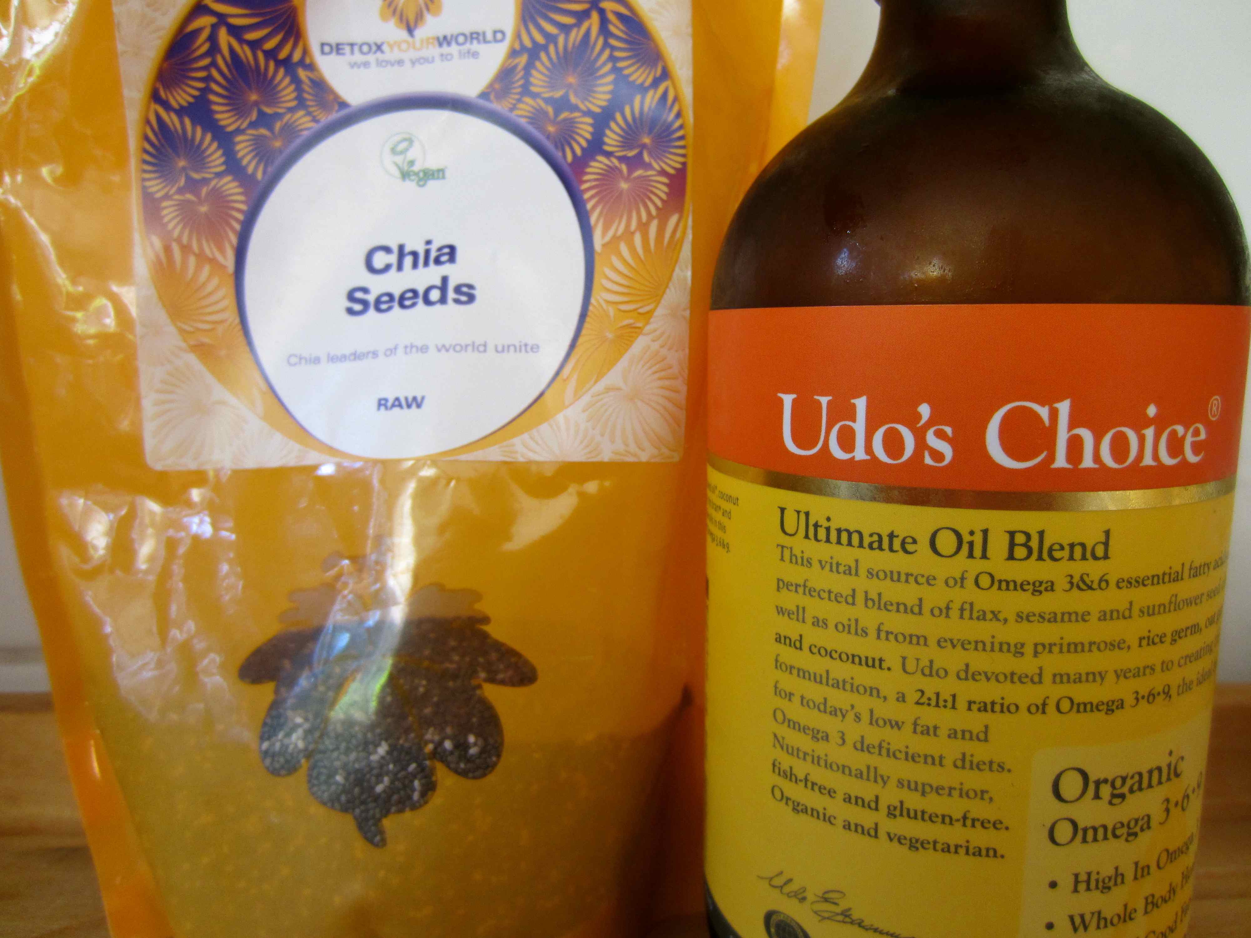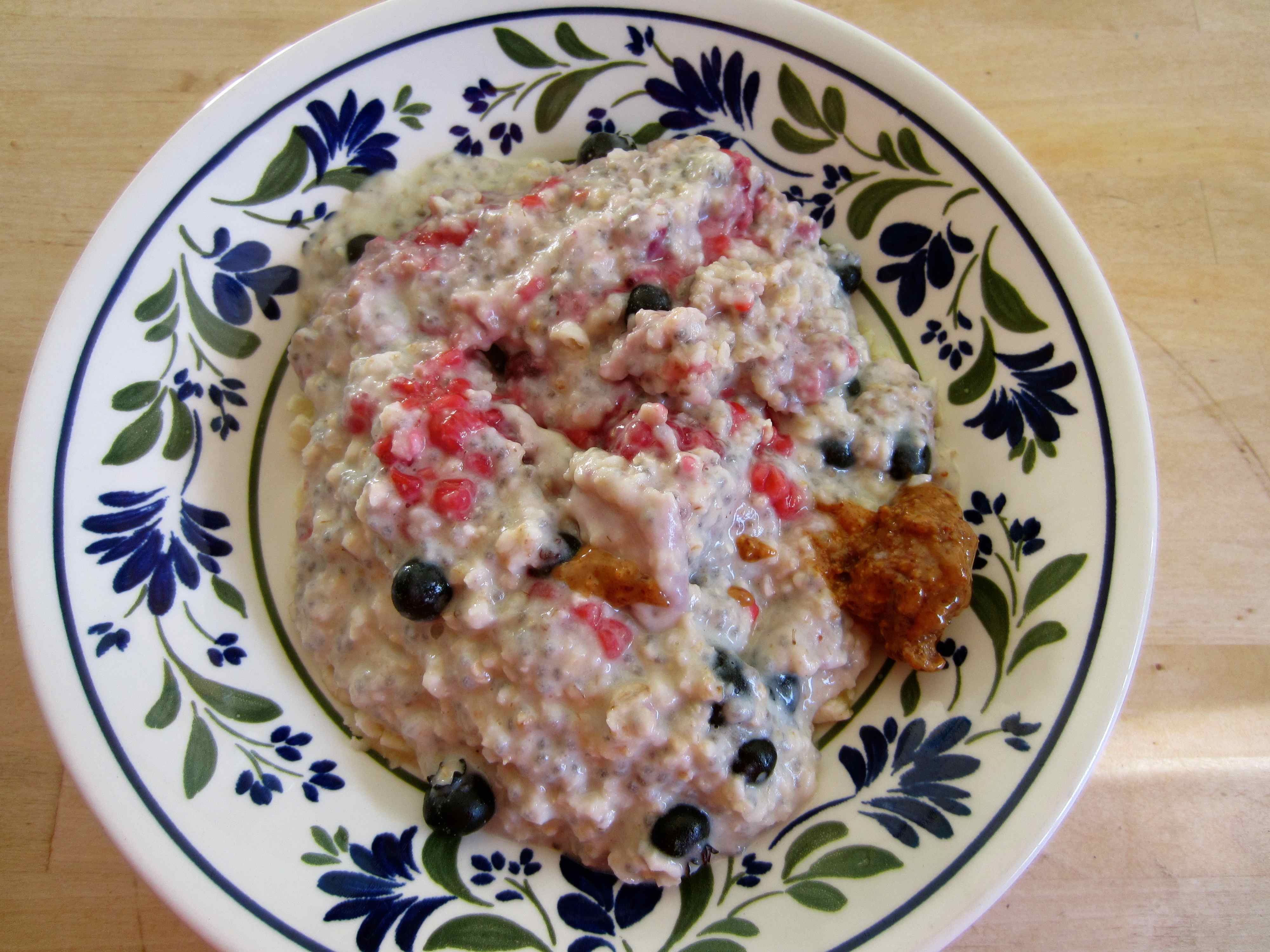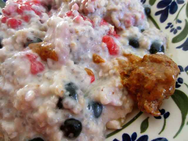 I made the porridge with (per person) 1/2 a cup of oats, 1/2 a cup of water, 3/4 cup of almond milk, 1/2 tbsp chia seeds and 1/2 tbsp Udo’s oil. I also stirred in some blueberries and raspberries.