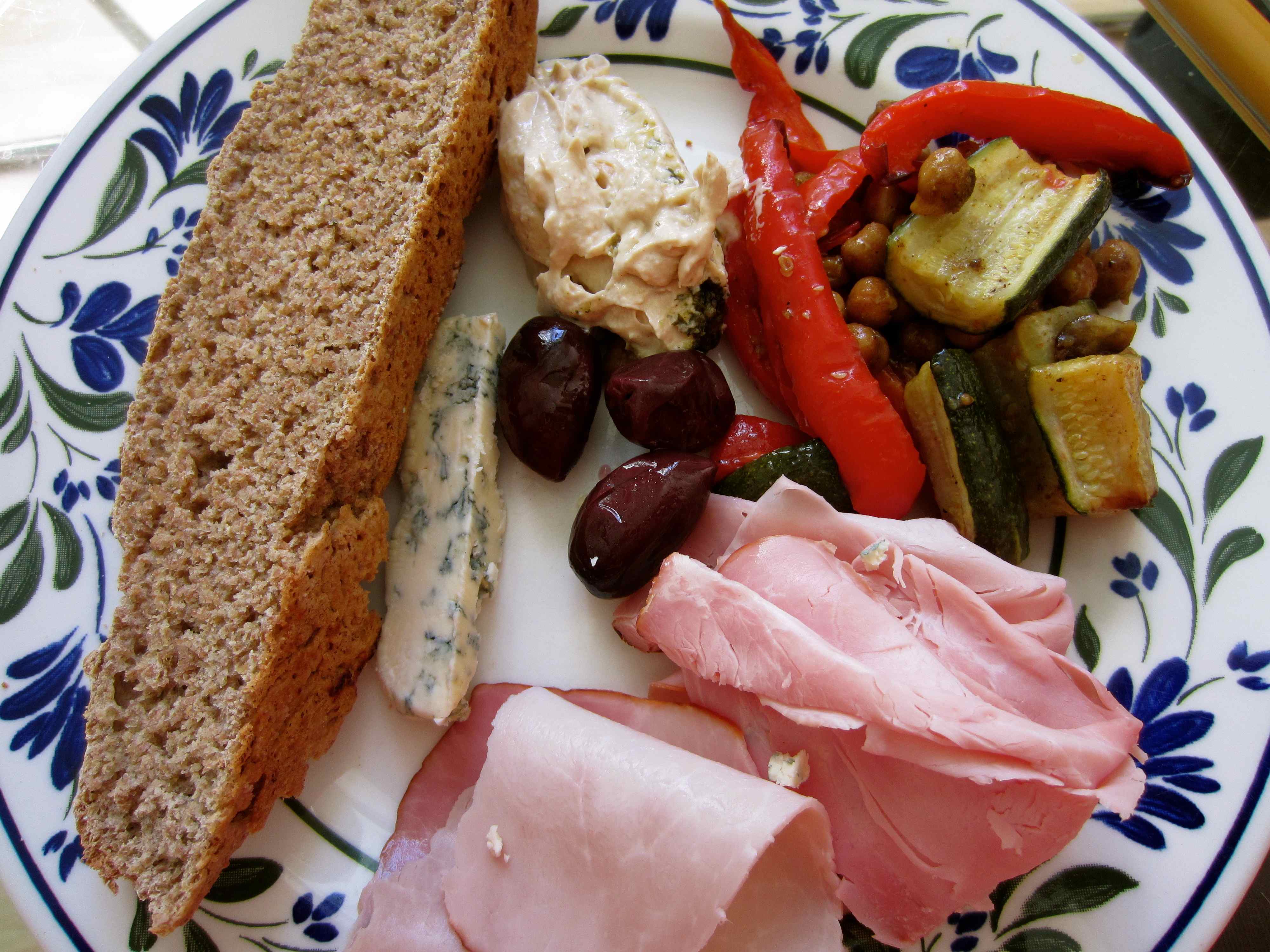 So we ate it for lunch. I had mine with some stilton, ham, humous, olives and left over roasted veg and chick peas.