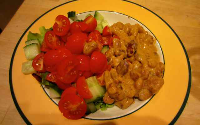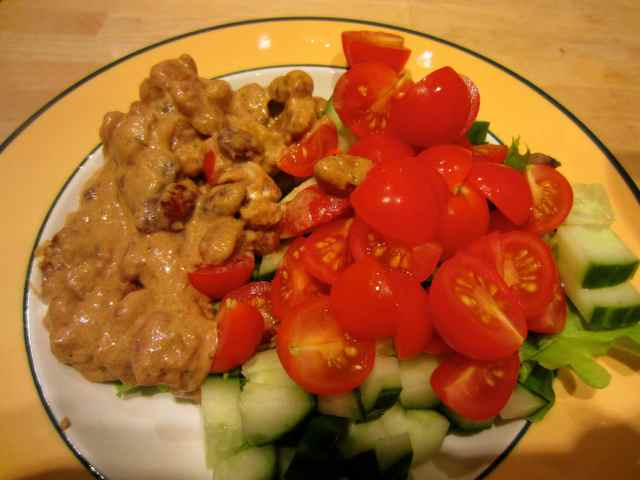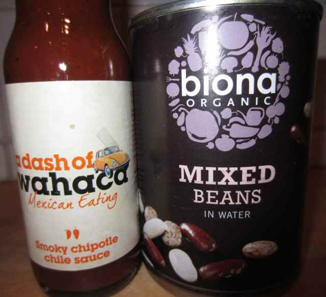 I had half a can of mixed beans, mixed with a heaped tablespoon of Cream Cheese and 1 level tbsp of the Chipotle sauce which I heated together in a saucepan. I served them with lettuce, tomatoes and cucumber.