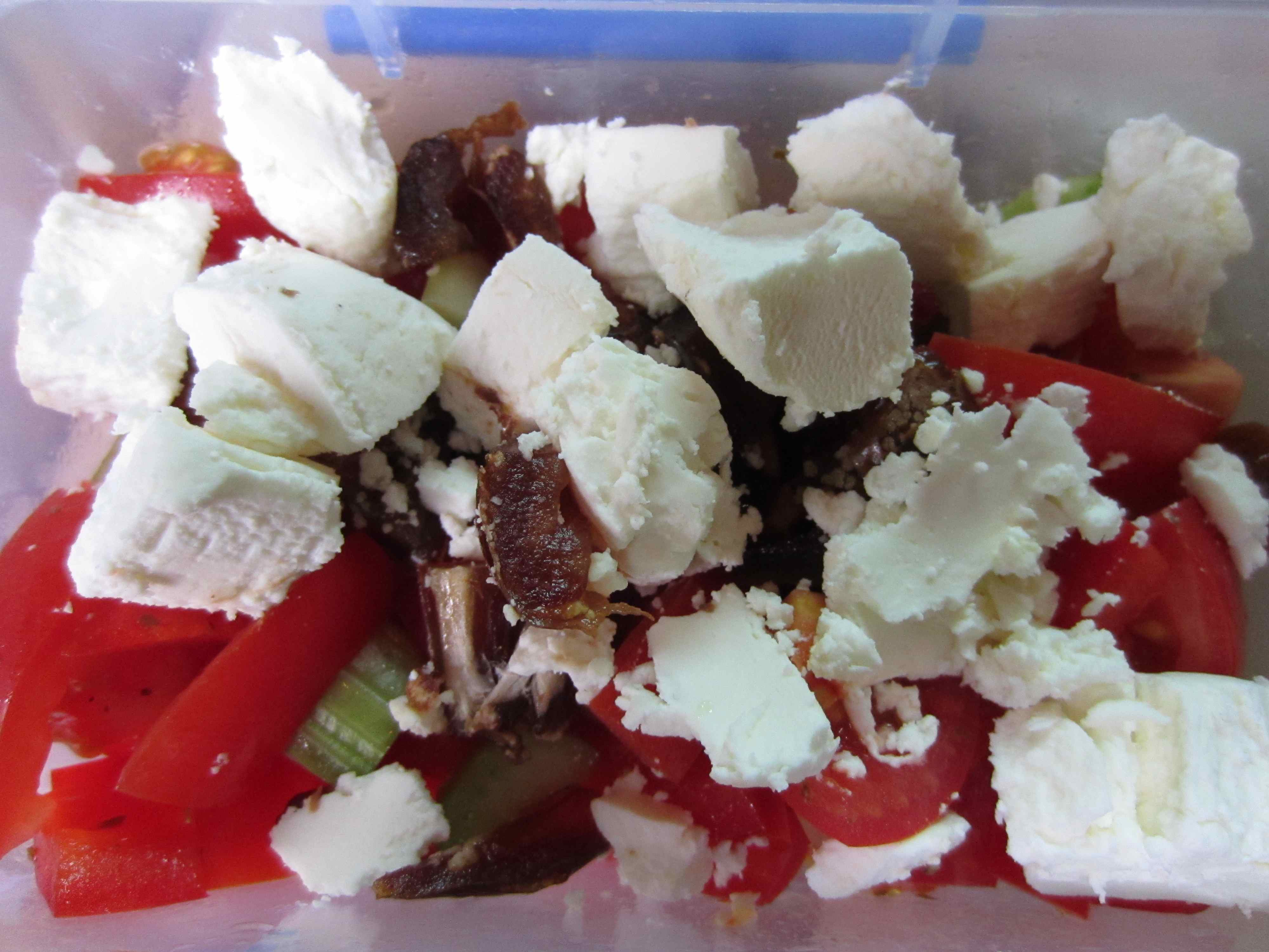 In the lunch box went tomatoes, celery, red pepper, goats cheese and 2 dates.  All chopped and mixed together with some herby oil my sister gave me for my birthday.   There were a lot of vegetables in my lunch box, despite the photo making it look like a tub full of cheese.