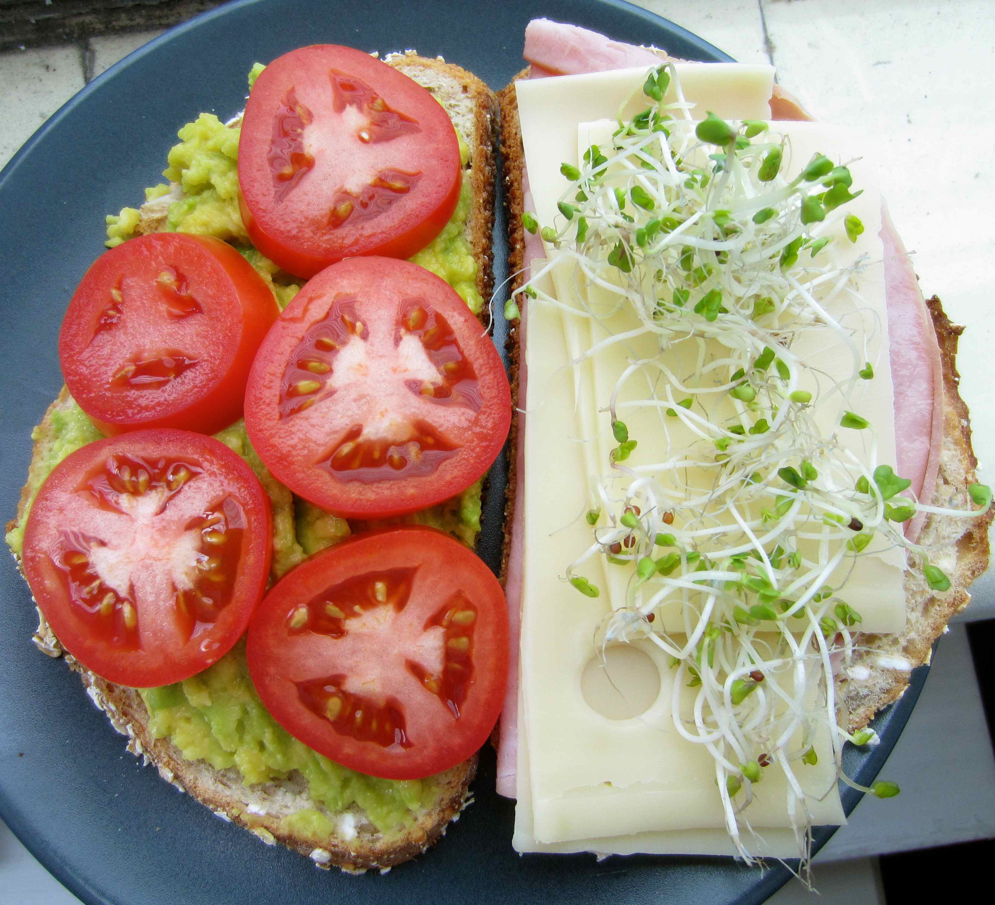 They joined 2 slices of multi grain bread, some mashed avocado, a plum tomato, 1 slice of ham and some Swiss cheese. It was very tasty.