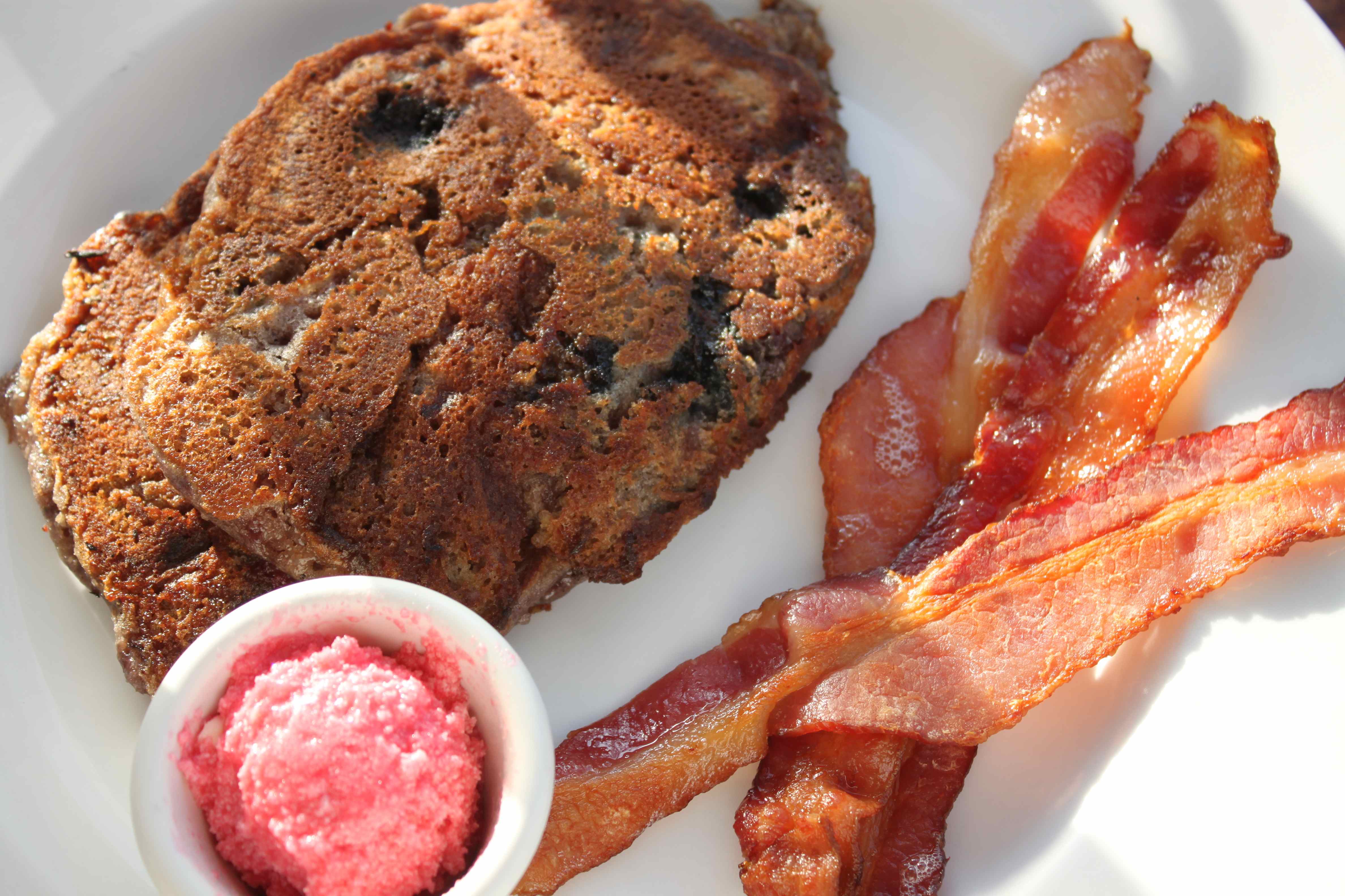 I went for the Very Berry Short Stack pancakes (there were 2) with bacon.  They were served with raspberry butter which was butter whipped with raspberries and icing sugar – absolutely delicious.  The pancakes had pureed berries inside which made them this dark colour.  One of the best pancake breakfasts I have ever had – and I have had a few!