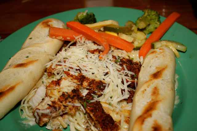 No salad for me tonight.  Linguine in a creamy sauce with blackened chicken, cheese and 2 bread rolls.  I devoured the lot in about 10 minutes and drank a beer while we waited for it.  I can’t even remember the name of the restaurant as we were in and out in a lot less than an hour because we were all tired and too hungry to take in and appreciate the surroundings.