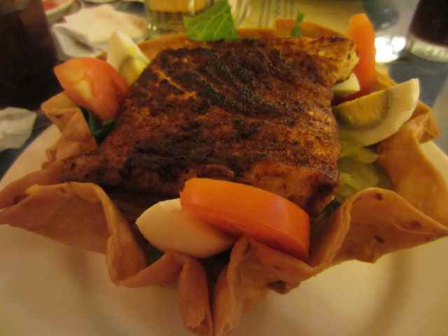 The fish was dry and the salad was essentially just lettuce. There were no chilies, tomato salsa, guacamole or sour cream to jazz it up a bit. There was about 1 tsp grated cheese, a couple of slices of tomato and an egg with a black ring around the yolk. It was all so tasteless I had to add salt and pepper to try and liven it up a bit. The waitress, who was really good, did bring some sour cream for us but it did little to help a very poor meal indeed.