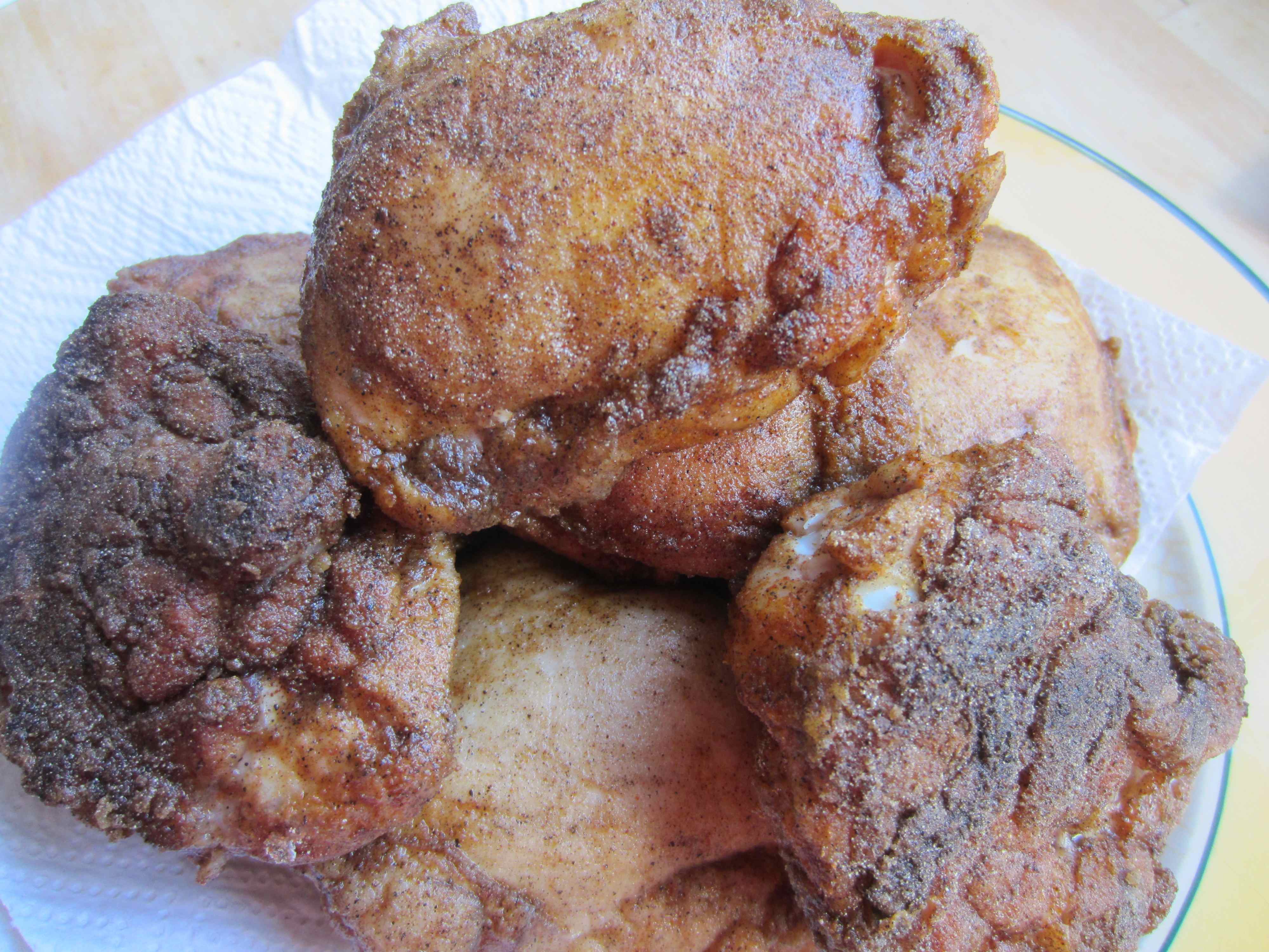 - Shake the excess flour from the chicken thighs and fry until browned on each side (about 5 minutes – I did mine in 2 batches)