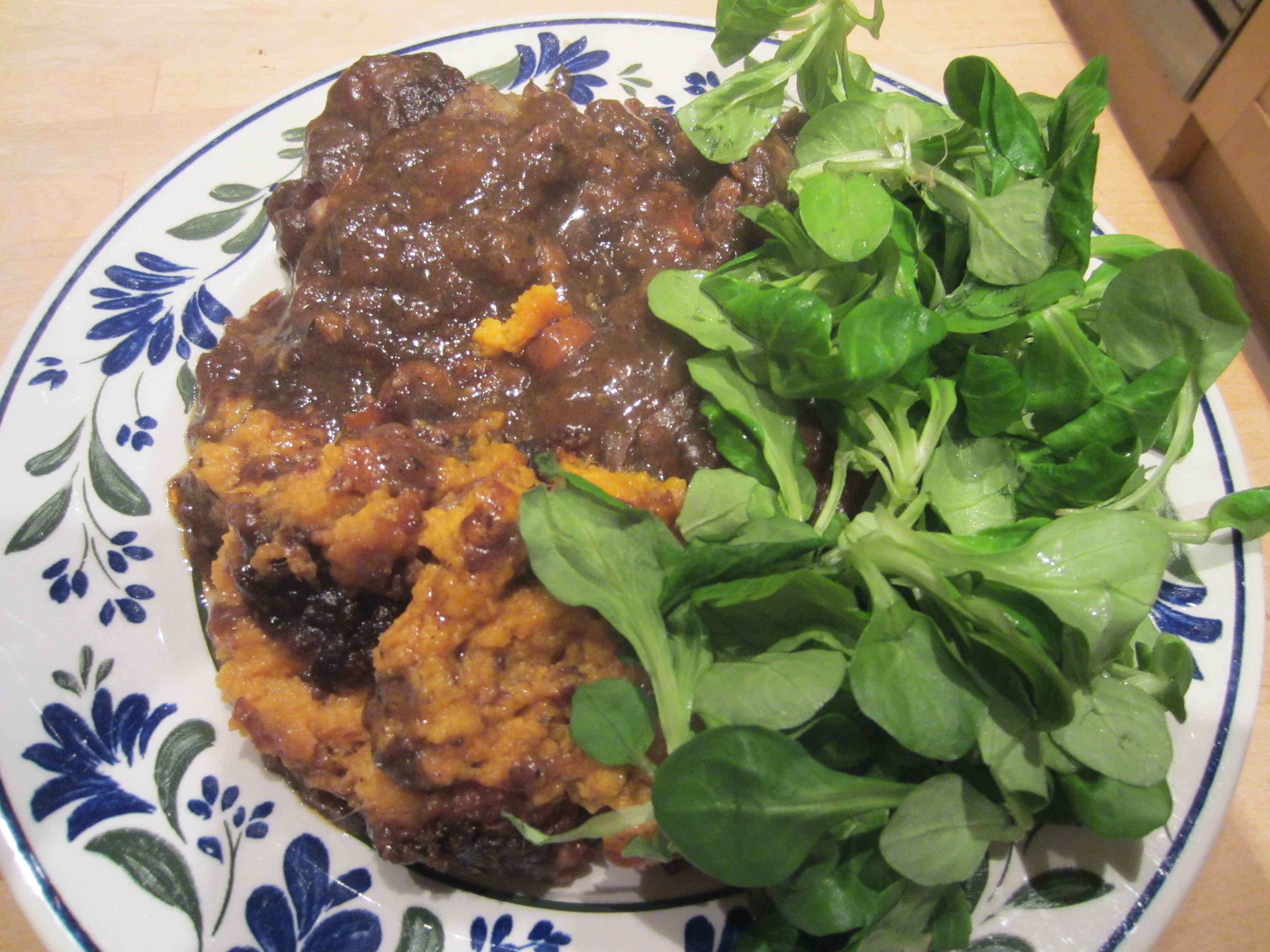 Supper was easy. I reheated a portion of the chicken and sweet potato dishes I made earlier in the week. The chicken and sweet potato dishes both reheated very well but it all looked rather brown so I added some lambs lettuce, one of my favourite greens.
