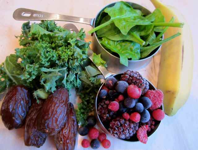 Made with 1 1/2 cups hazelnut milk, 1 cup kale, 1 cup spinach, 1 banana, 1/2 cup frozen berries (you could use fresh) and 4 dates. Just look at these wonderful nutritious foods.