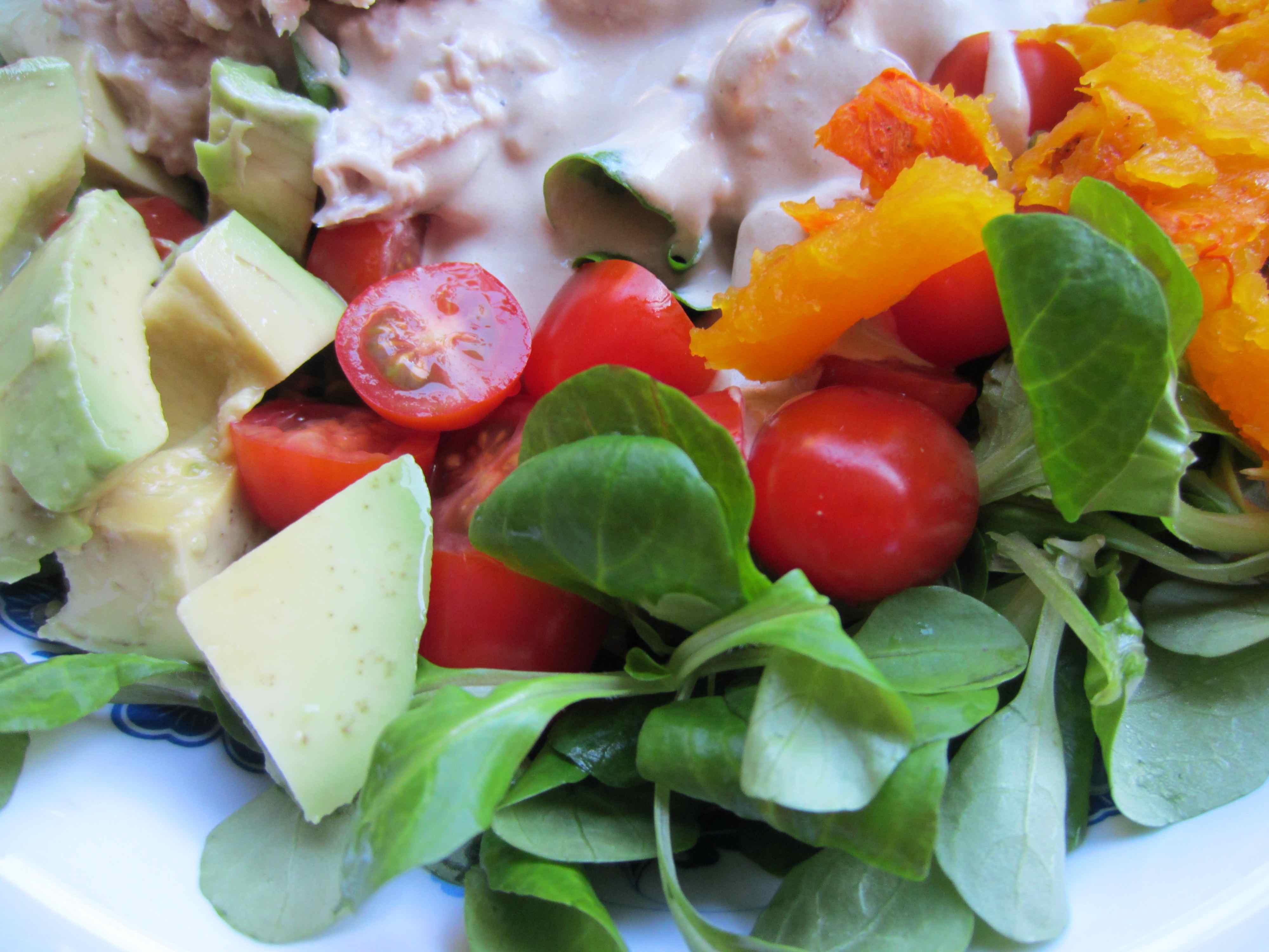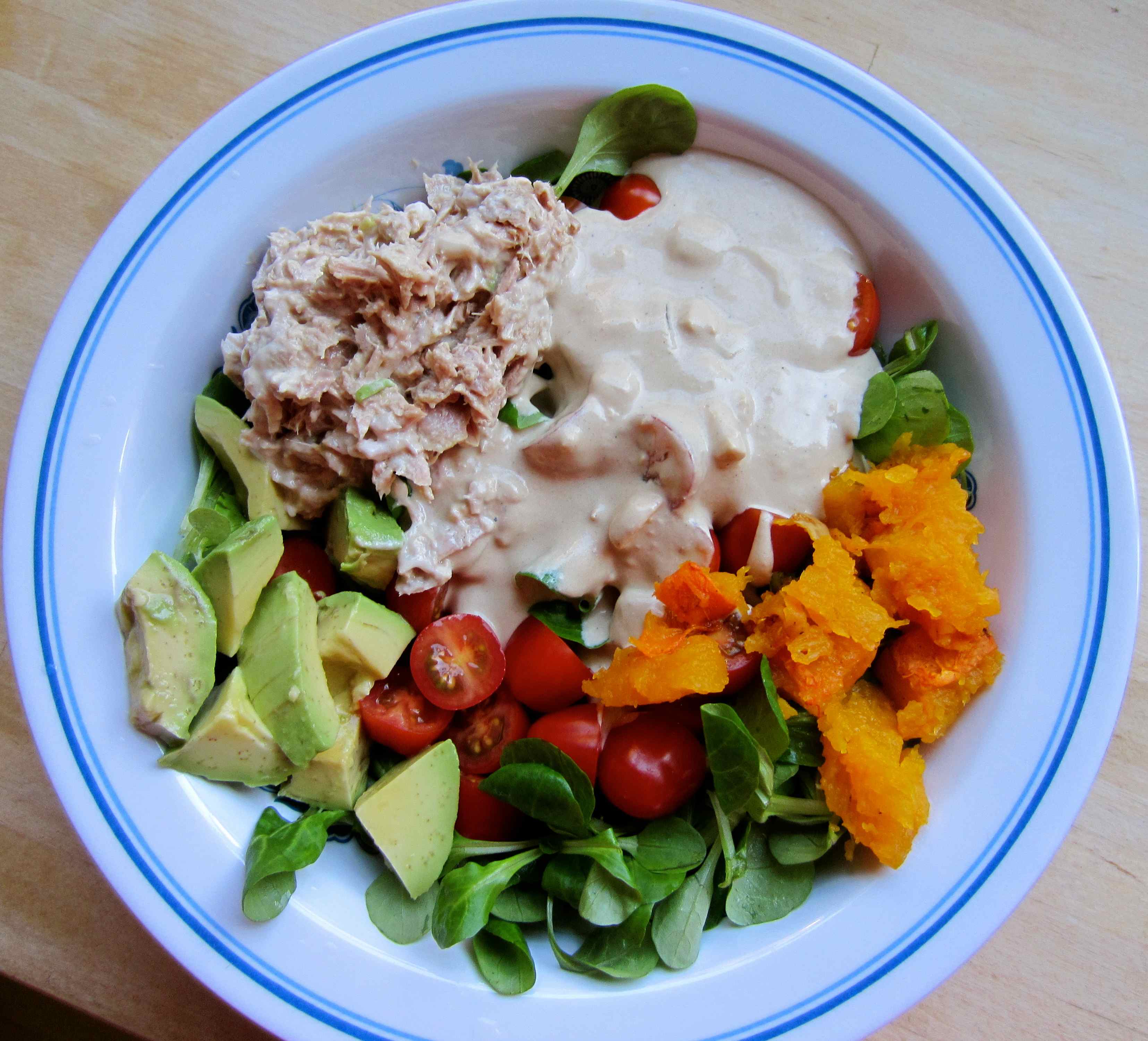 I added the baked squash to a salad of lamb’s lettuce, cherry tomatoes and 1/2 an avocado which I topped with Blue Cheese Dressing and tuna in mayonnaise.