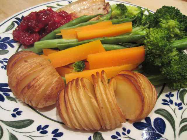 Hasselback potatoes are made by thinly slicing the potato about 3/4 of the way down, basting with melted butter and oil. They take about an hour to cook in a hot oven (200 ° C). They are crispy on top and soft potato near the bottom. Delicious. High in fat for a healthy diet but as a little treat, delicious.
