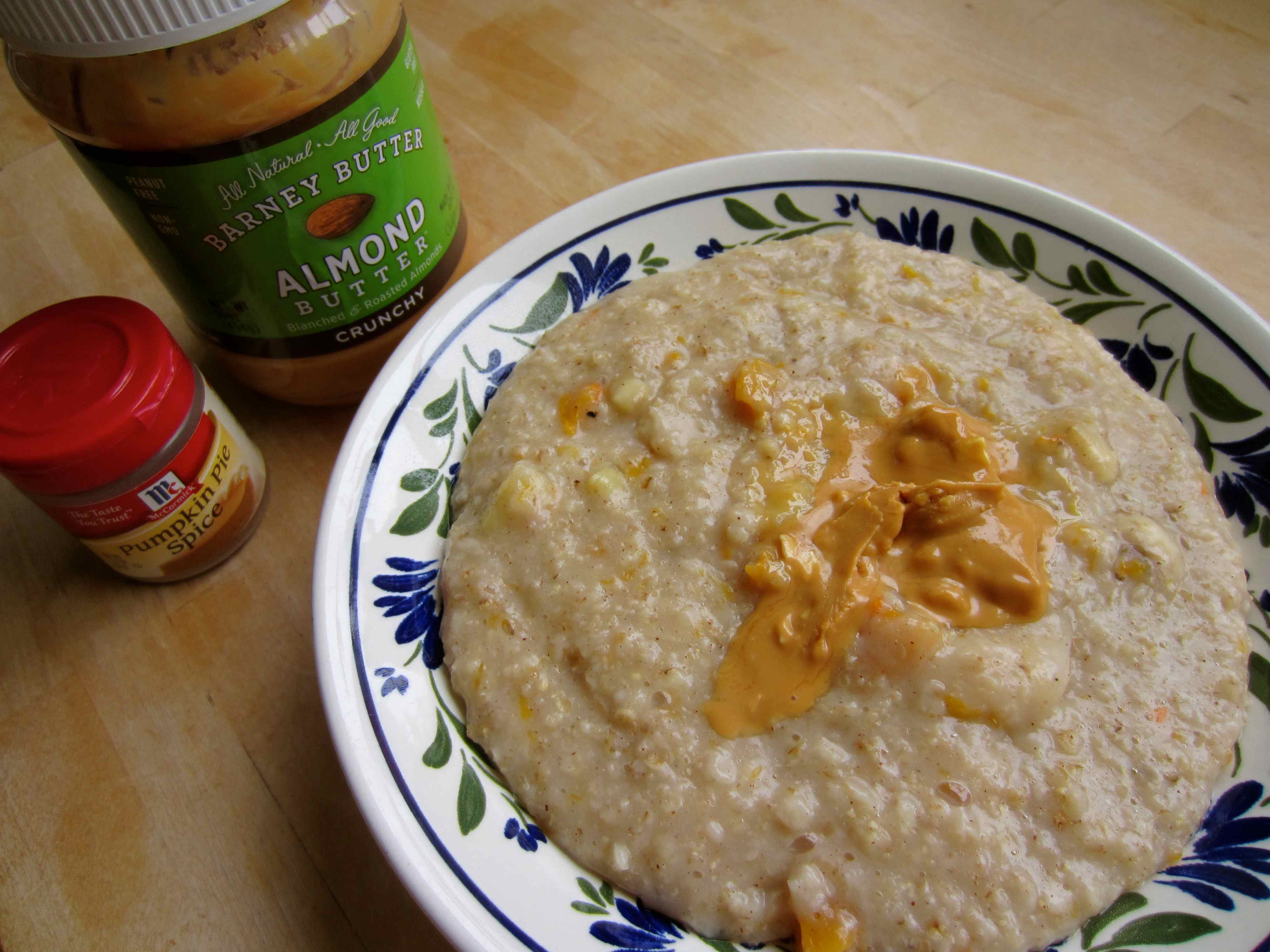 Breakfast: 40 g oats (4 points), made up to porridge with water, with some butternut squash mashed in, pumpkin pie spice and a banana.  Topped with 1 tbsp Barney Butter (3 points).  Barney Butter is a brand of almond butter that some of the blogs I regularly read rave about.  So I bought some in Florida to try.  Wish I’d bought more than 1 jar!
