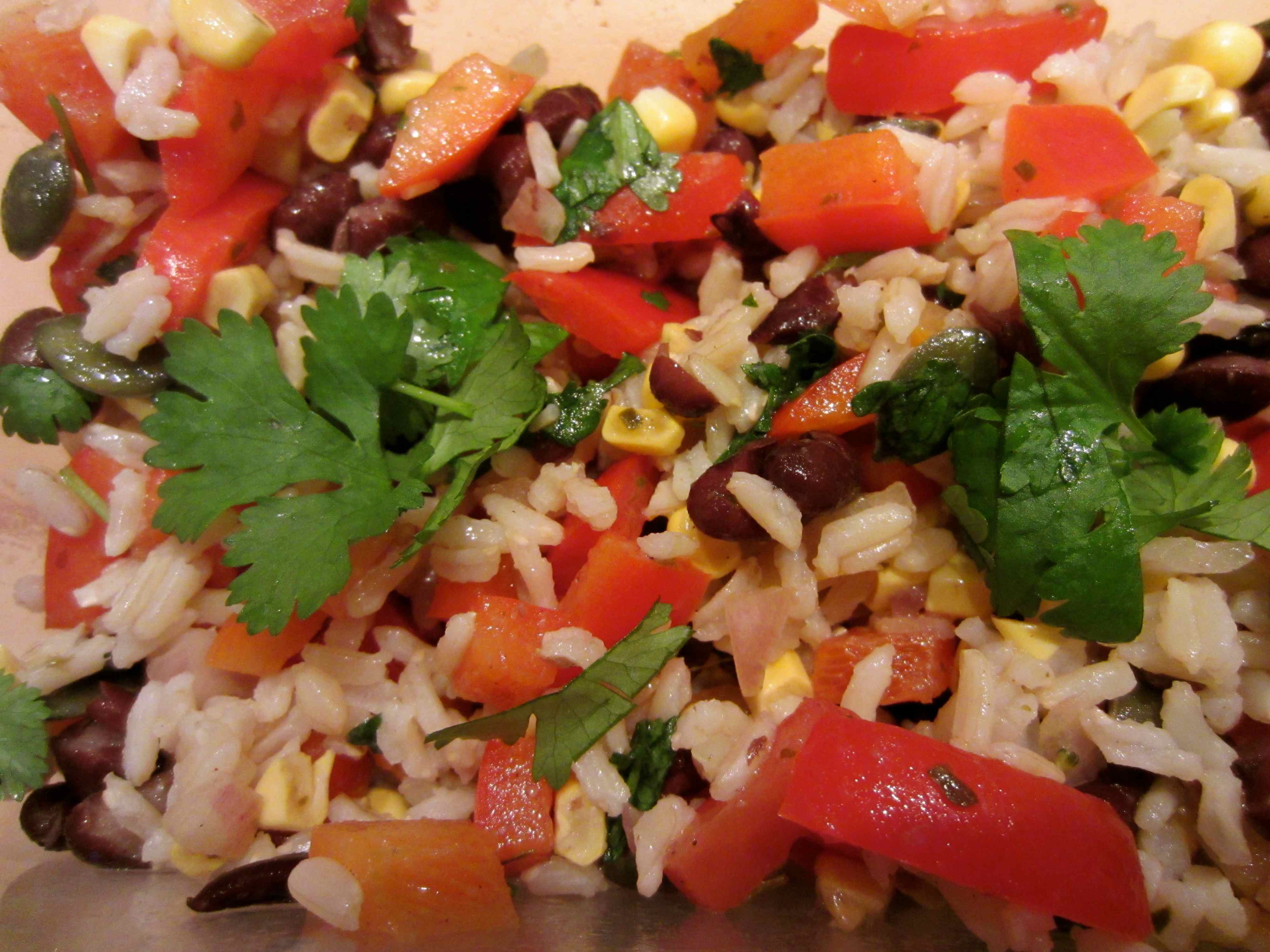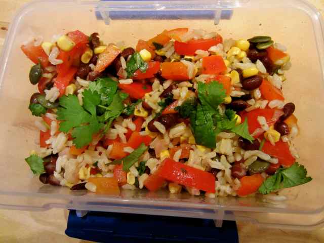 Supper was easy. It was sitting in the fridge waiting for me 🙂 I had a portion of the black bean salad I made on Sunday lunch time with 70 g of brown rice left over from last night’s dinner. It was quite high in points but I knew that because I calculated it the night before and so made allowances during the day. The black bean salad was 9 points (beans =3, pumpkin seeds = 1, oil = 4 and corn = 1) and the rice was 3 points.