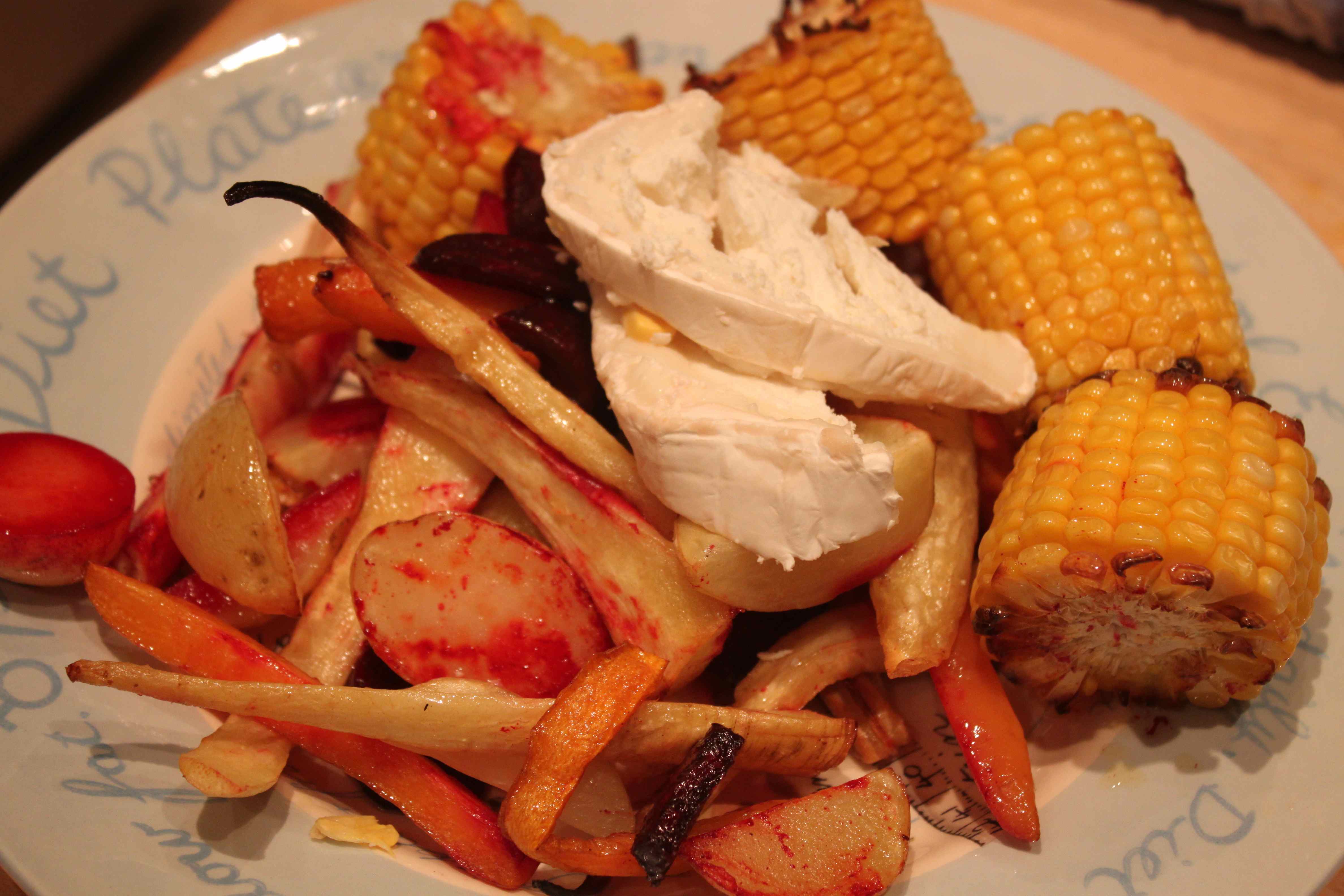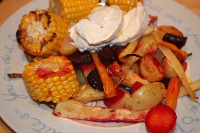 I pulled up some parsnips, carrots, beetroot and potatoes from the garden for supper. Scrubbed the vegetables, added a corn cob I found lurking about in the fridge, drizzled with oil, seasoned and baked in the oven on about 190 °C for 40 – 50 minutes.