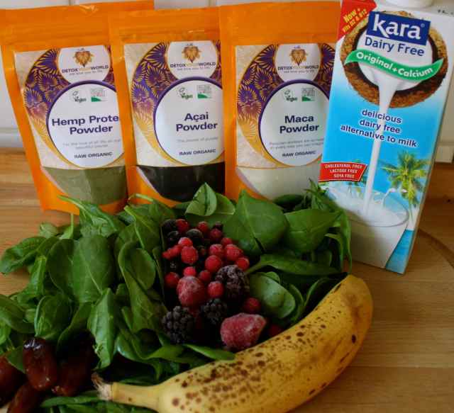 coconut milk plus Hemp protein powder, Acai powder and Maca powder to add some antioxidants and extra nutrients.