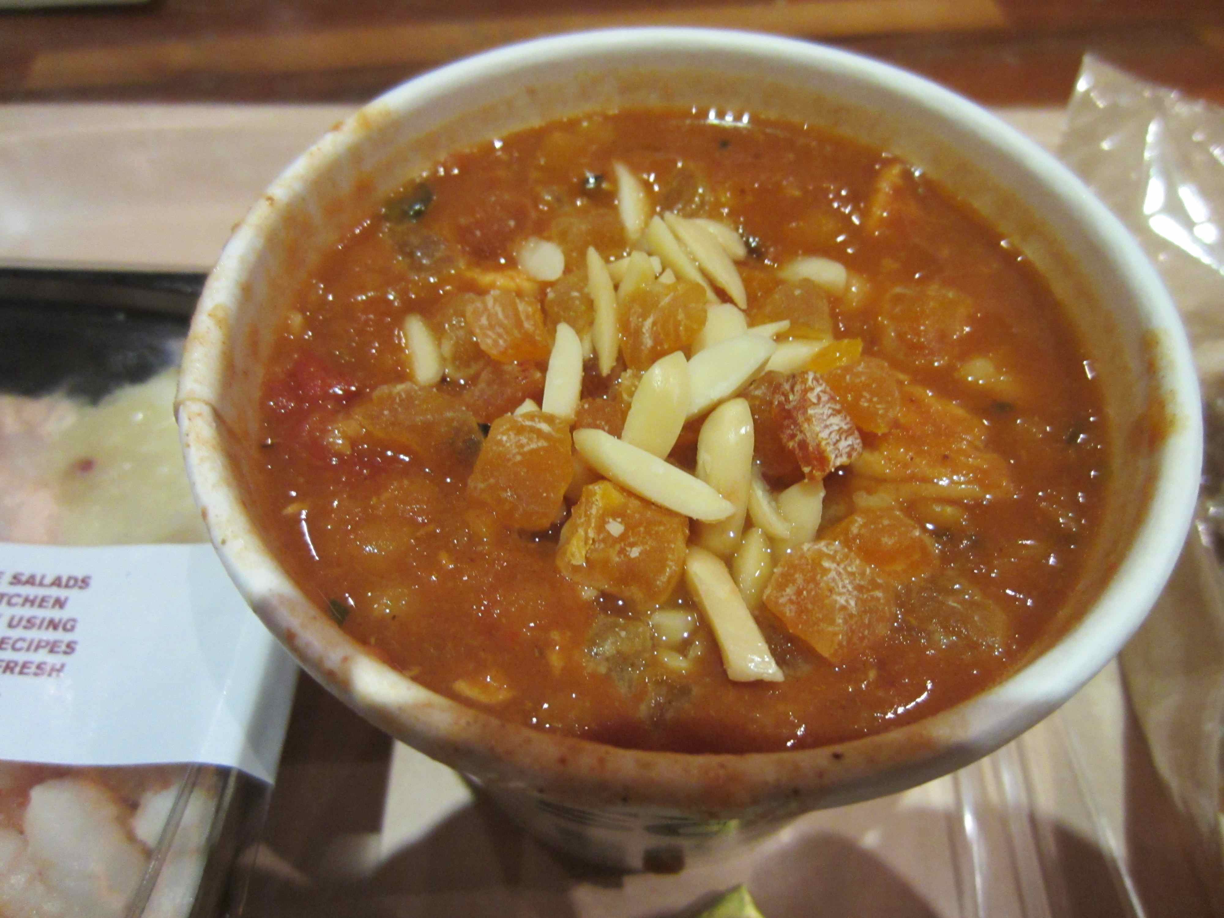 The soup was lovely; chicken, tomato, light spicing and topped with almonds and apricots.  Really good.