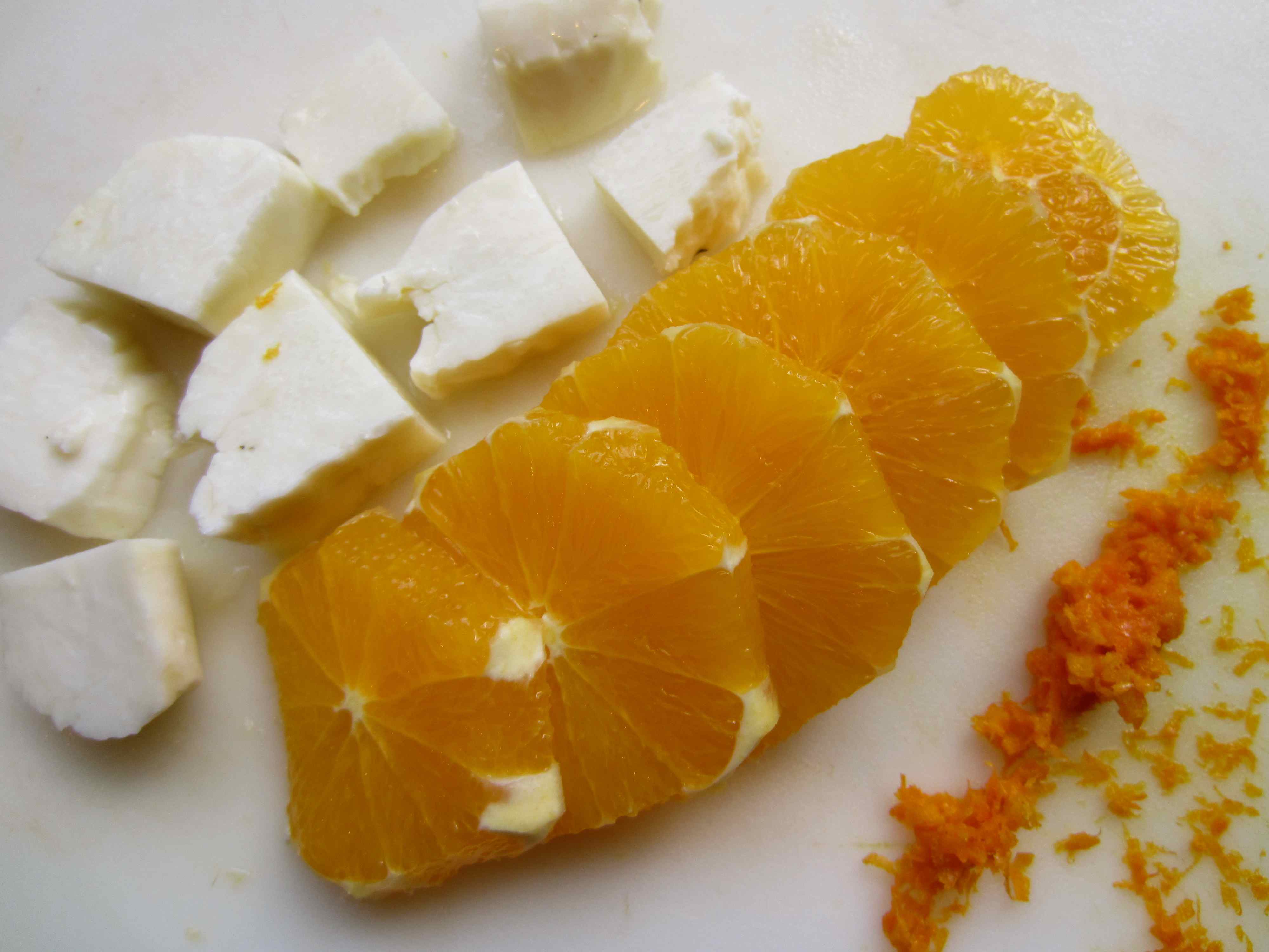 • Gently fry the orange pieces and halloumi so the orange caramelises slightly and the halloumi browns a little.