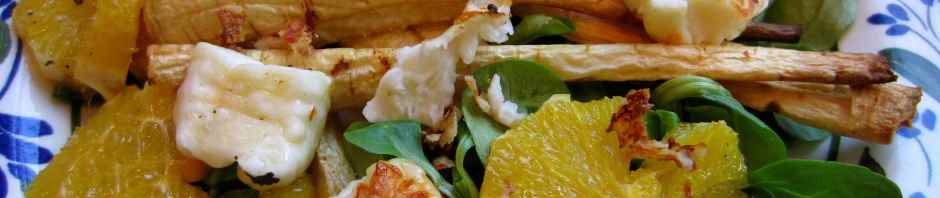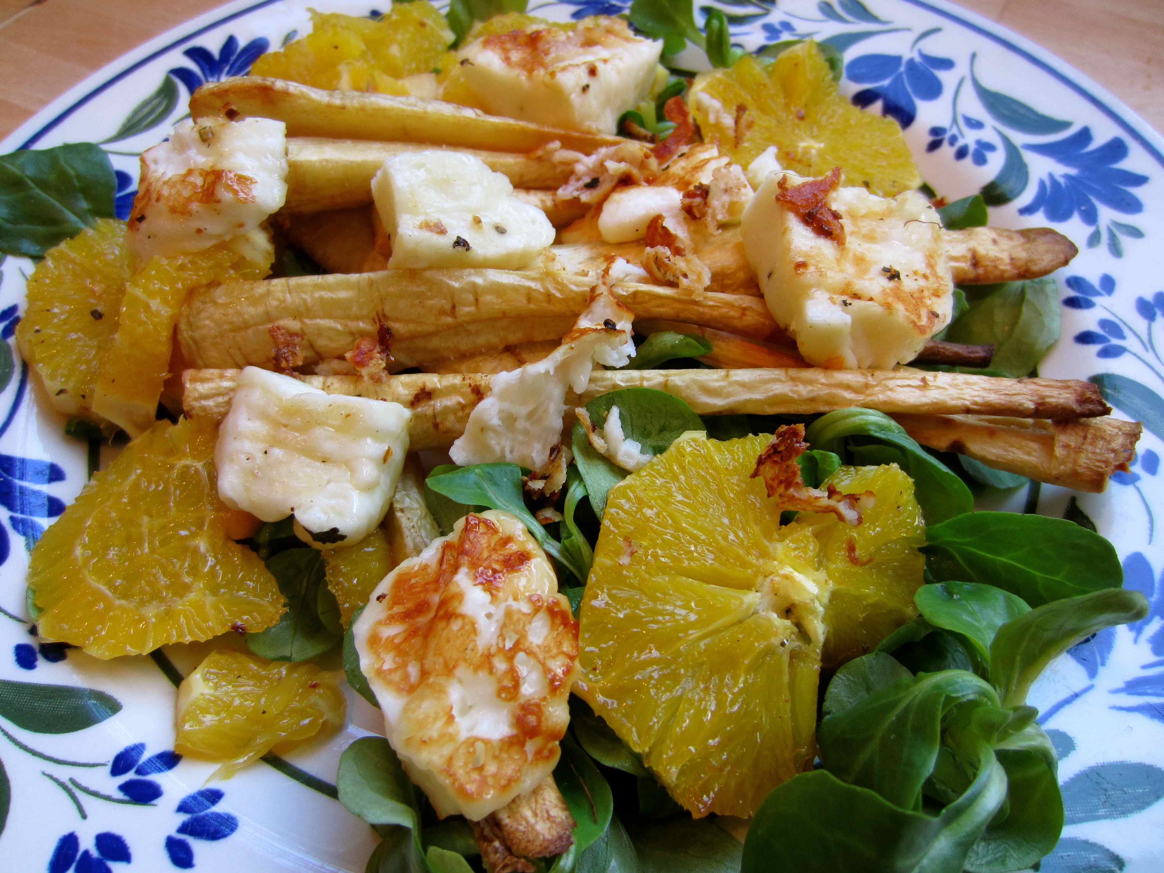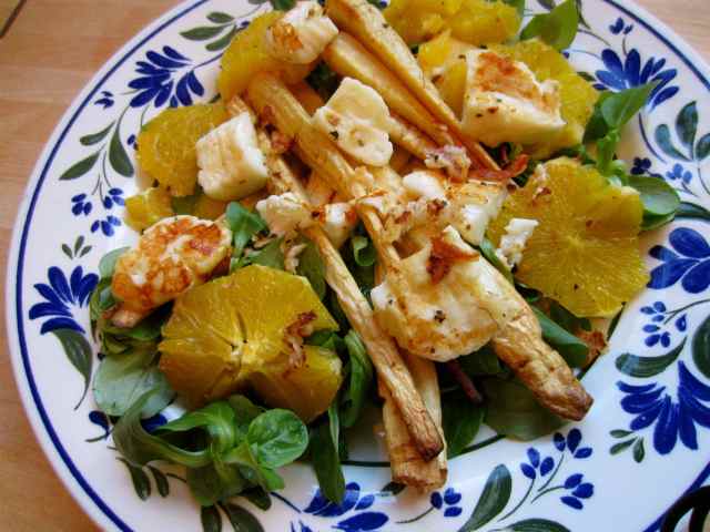 This salad was fantastic.  The salty chewy halloumi went perfectly with the sweet, soft and juicy oranges.  By cutting the parsnips lengthwise you get crispy ends and warm sweet soft ends.  The chilli and orange zest add spice and freshness.  Brilliant and inspired.  Thank you for this wonderful recipe.