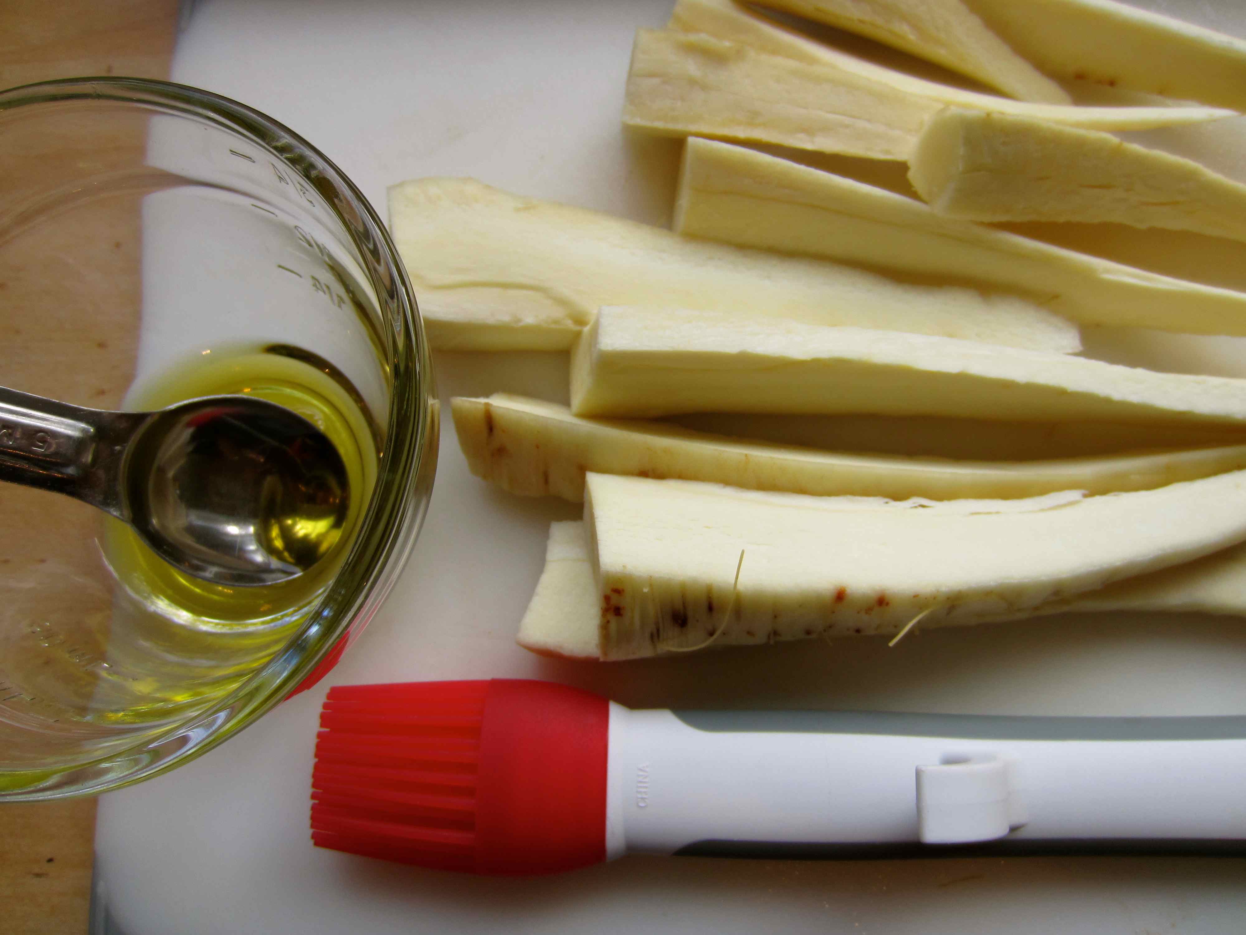 • Brush the parsnips with some of the olive oil, place on a baking tray and bake in the oven for 20-25 minutes