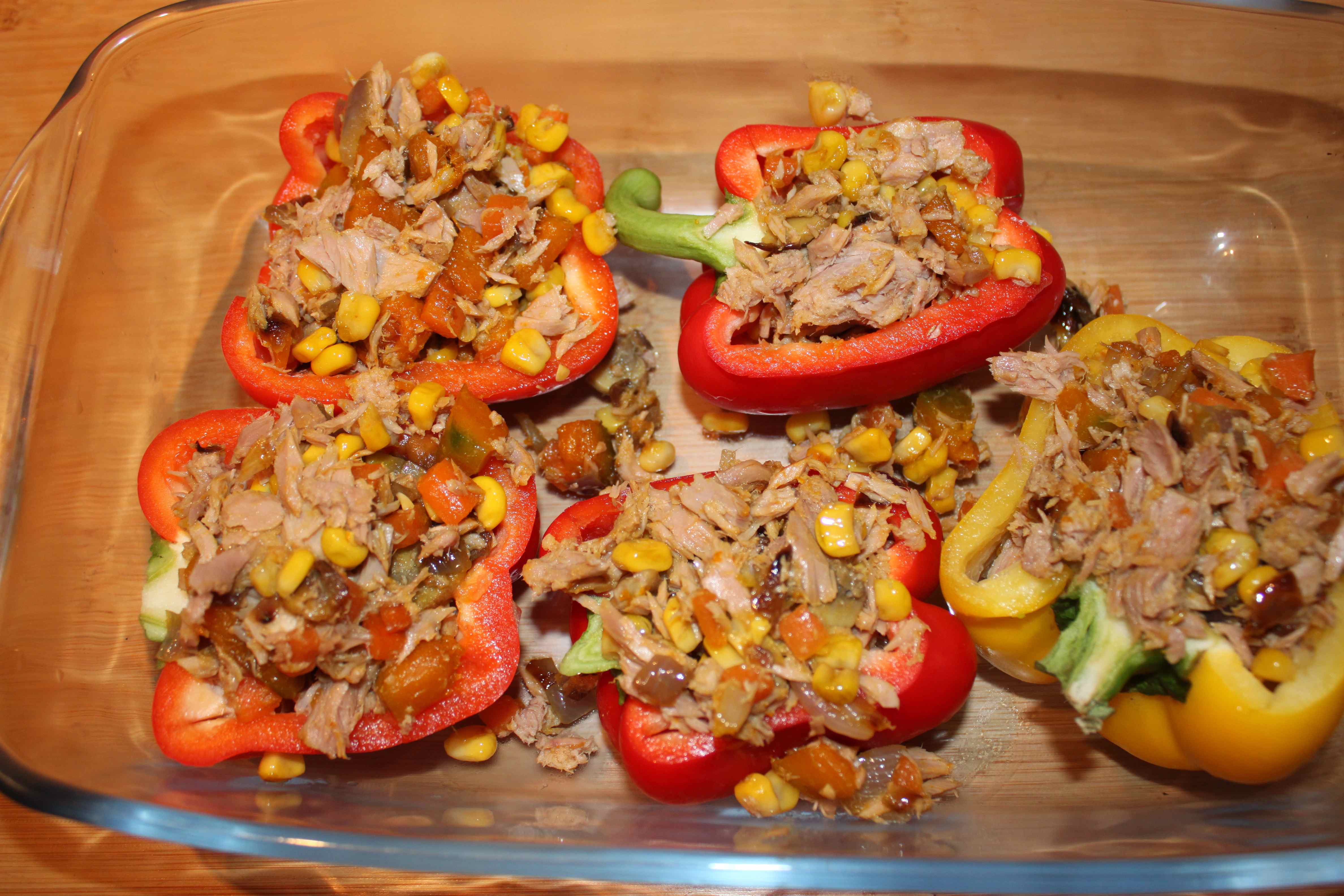 - Place the tuna and vegetable mixture in the pepper halves.