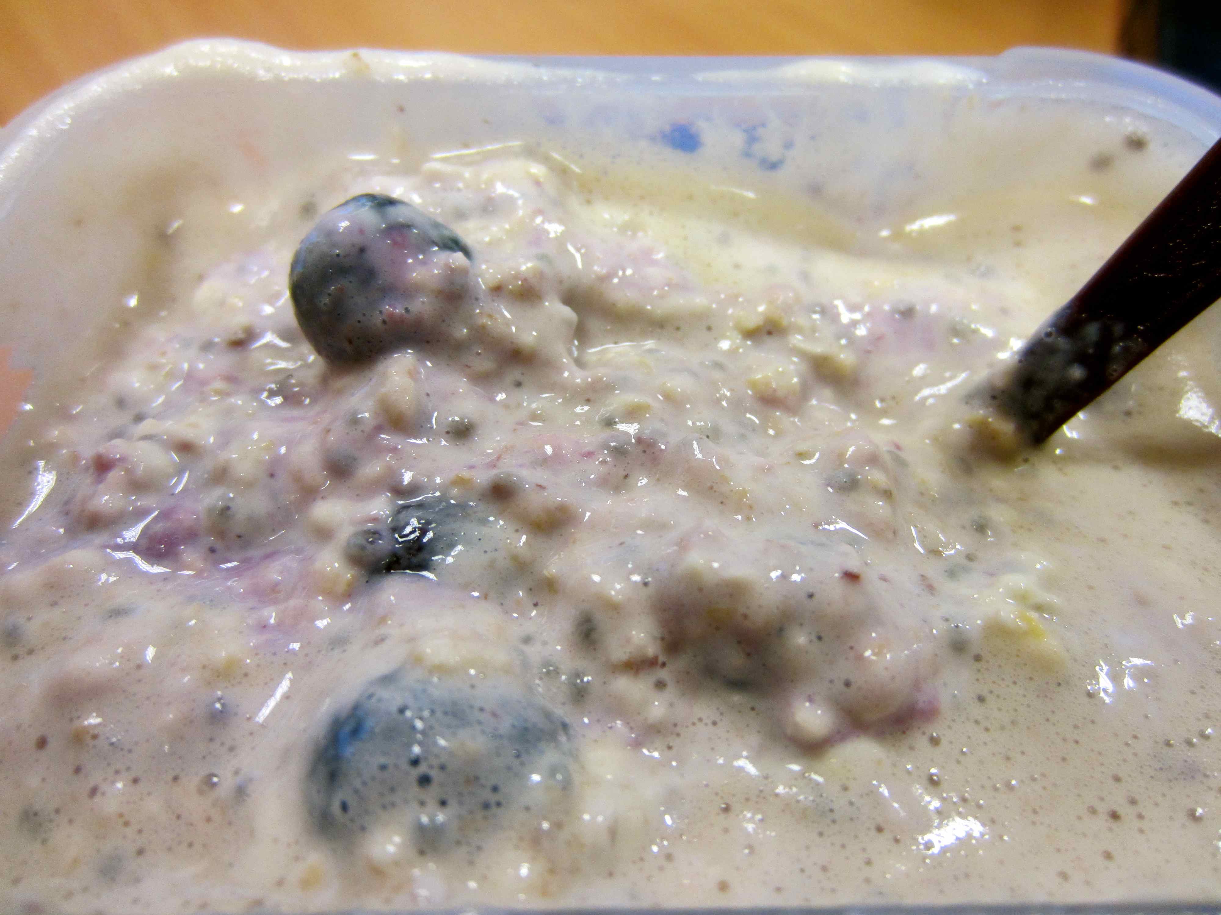 This morning I took in some overnight oats with chia seeds, natural yogurt and soya milk with added blueberries.Overnight oats with blueberries