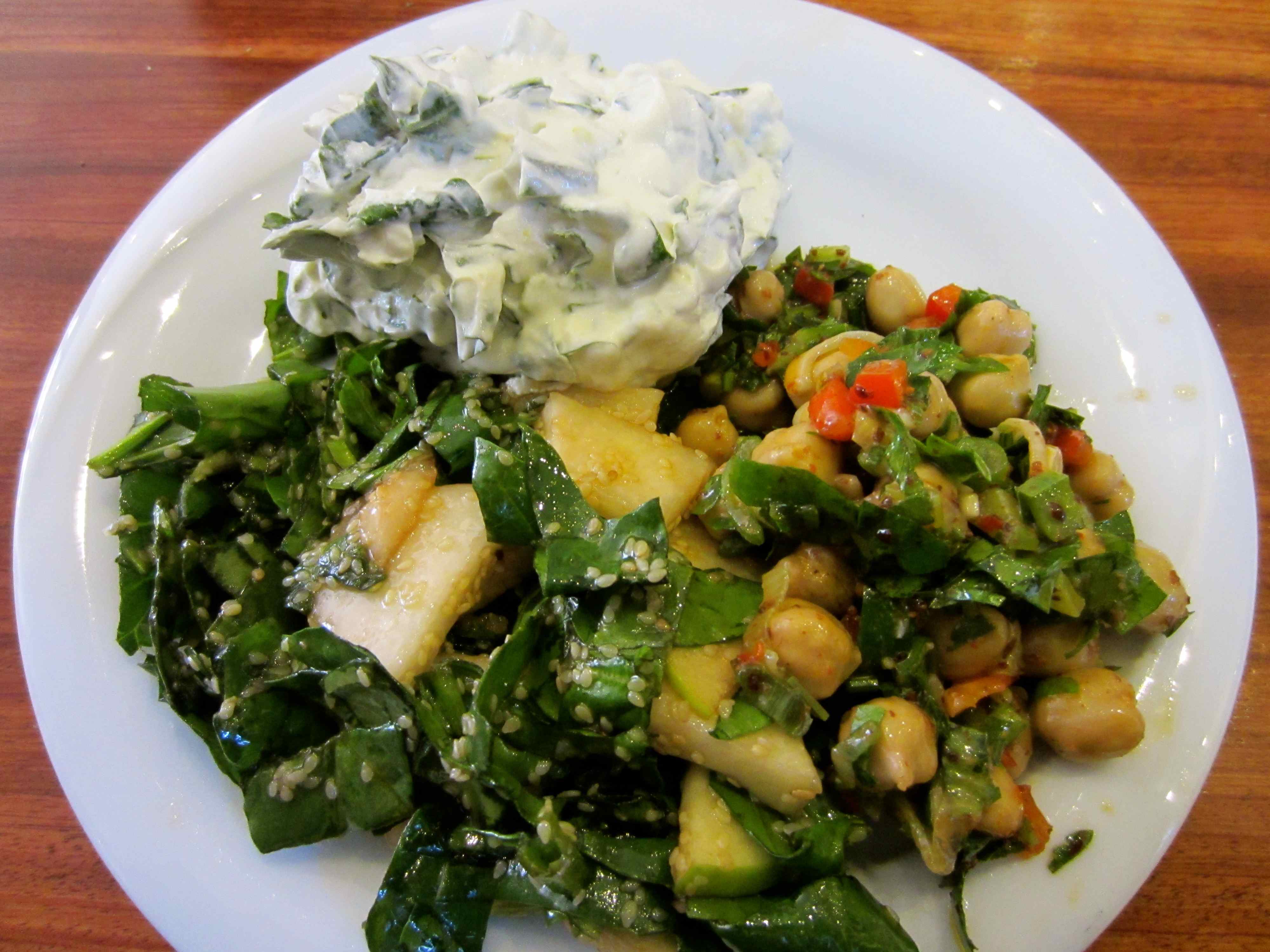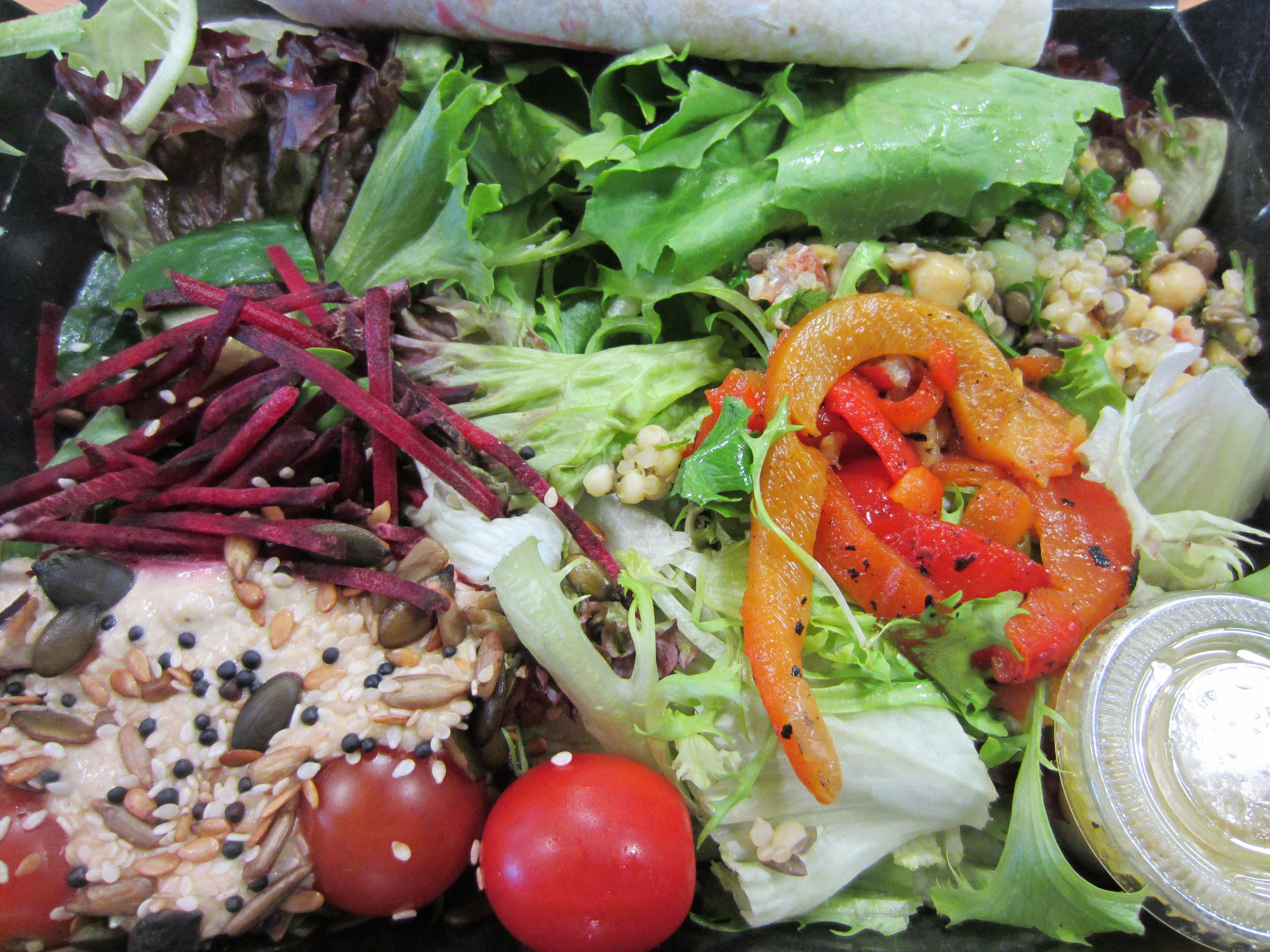 I popped round the corner for lunch with Kevin to the usual – TAS cafe.  I had 3 salads: spinach and apple, chick pea and tzatziki (yogurt and cucumber).