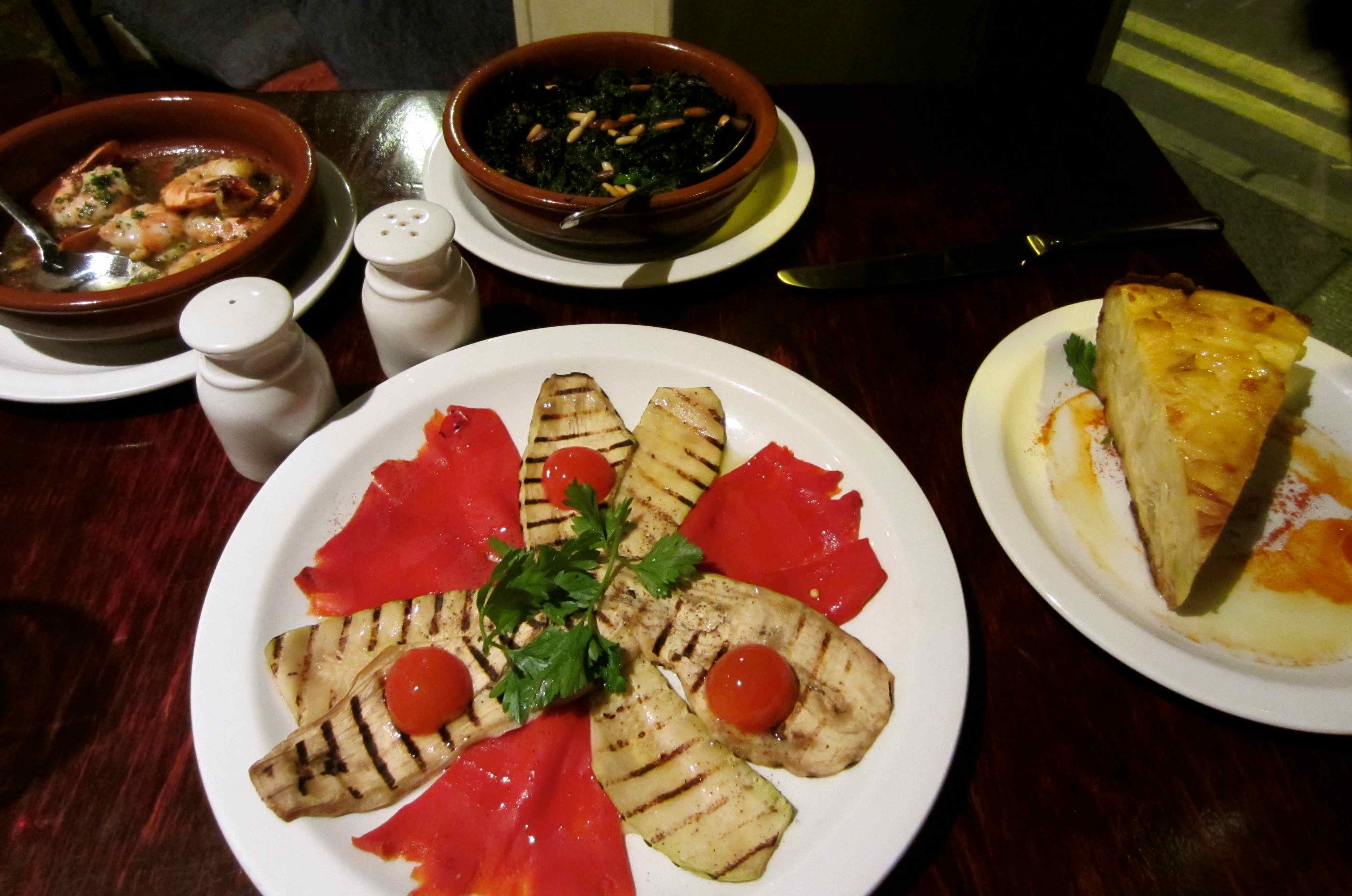 We went out for tapas round the corner and ordered 4 dishes which we shared: tortilla, garlic prawns, grilled vegetable salad and spinach with raisins and pine nuts.  It was all good and the prawns and spinach were fantastic.Tapas
