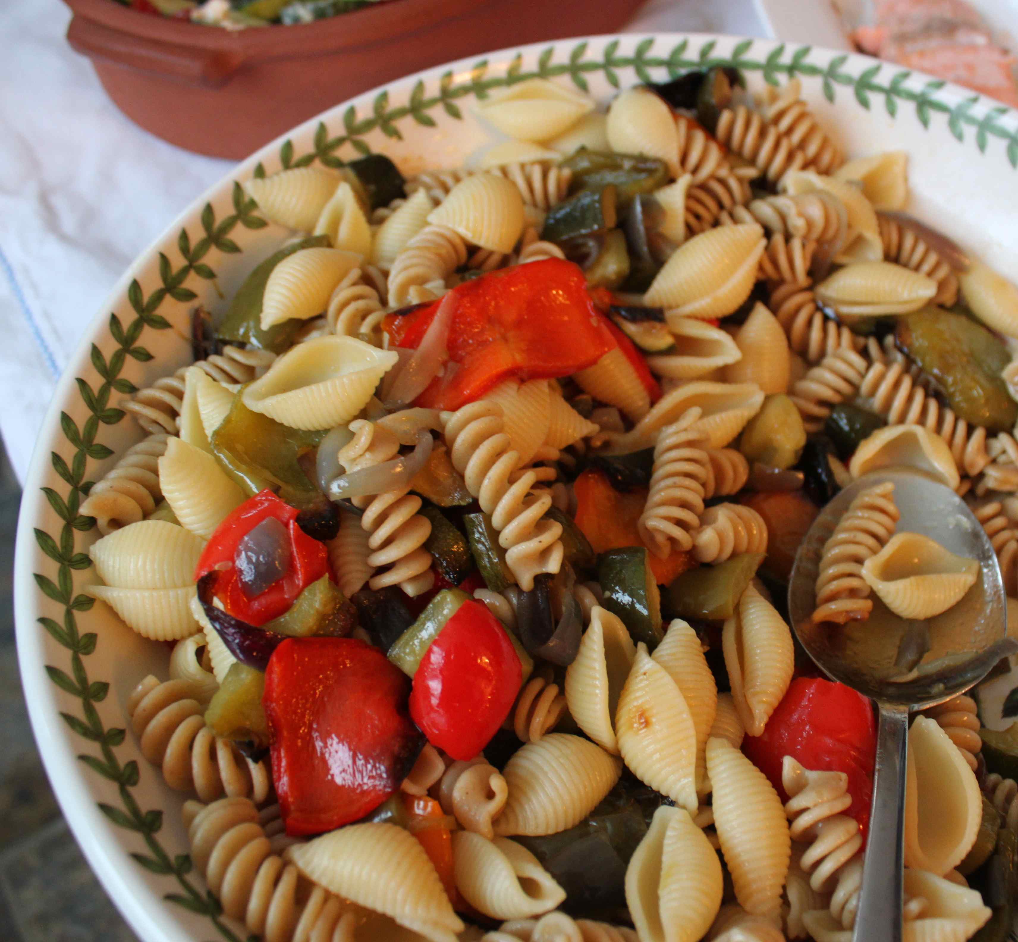 pasta and roasted vegetables salad (peppers, courgette and red onion)