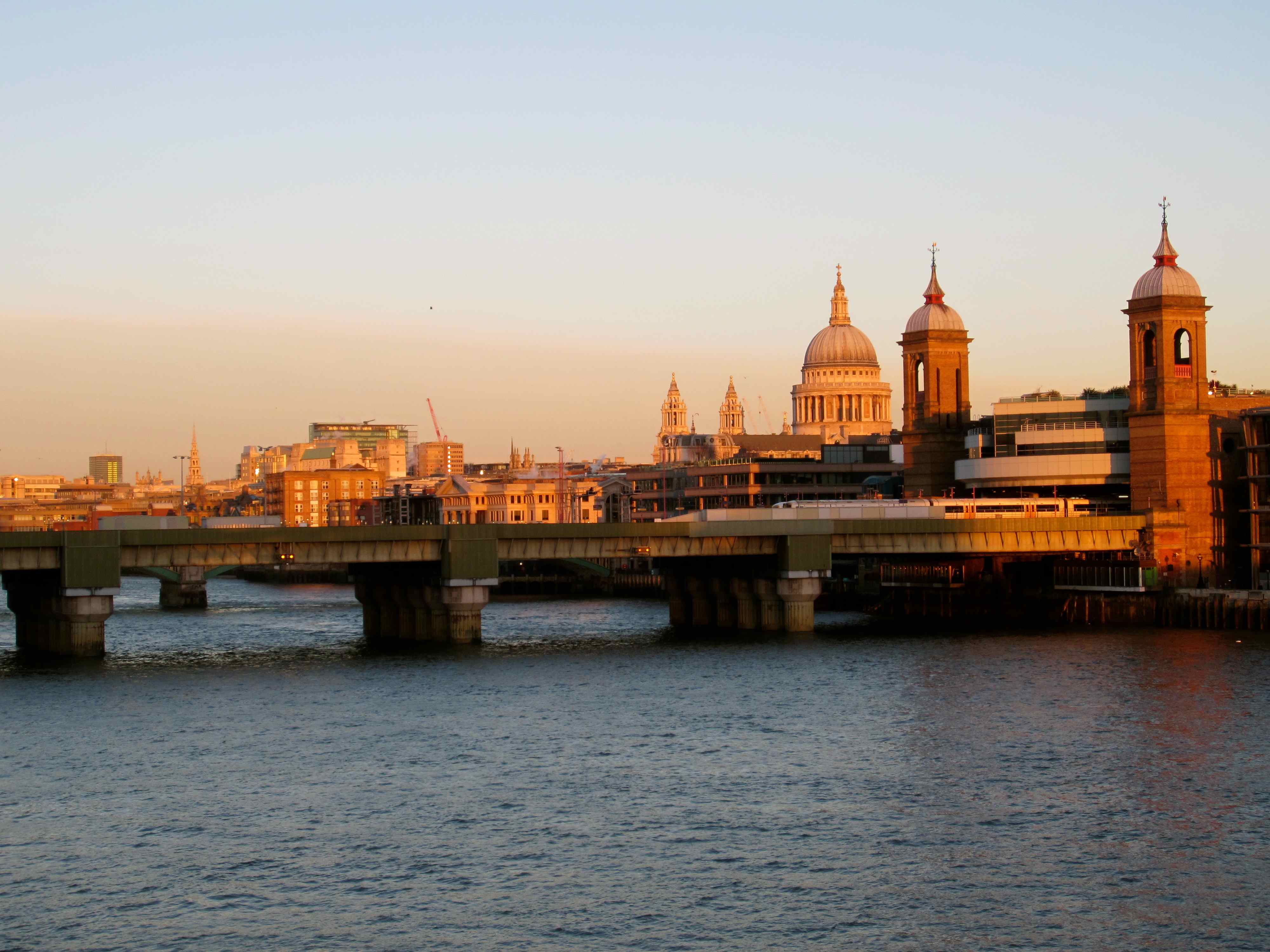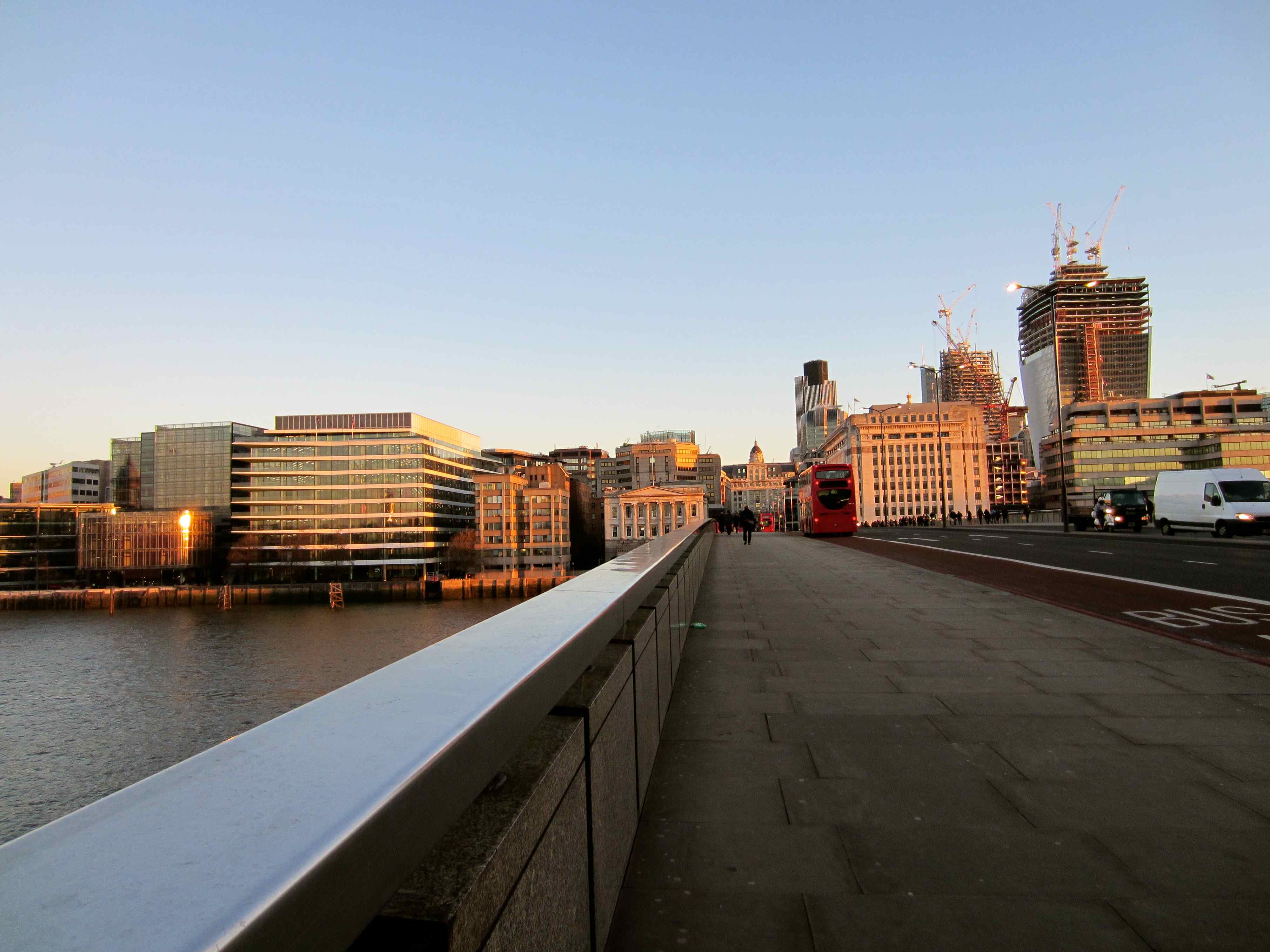 The buildings were briefly touched with a warm orange colour as the sun rose. This is the bridge between London Bridge and Cannon Street stations with Cannon Street station and then St.Paul’s in the background.