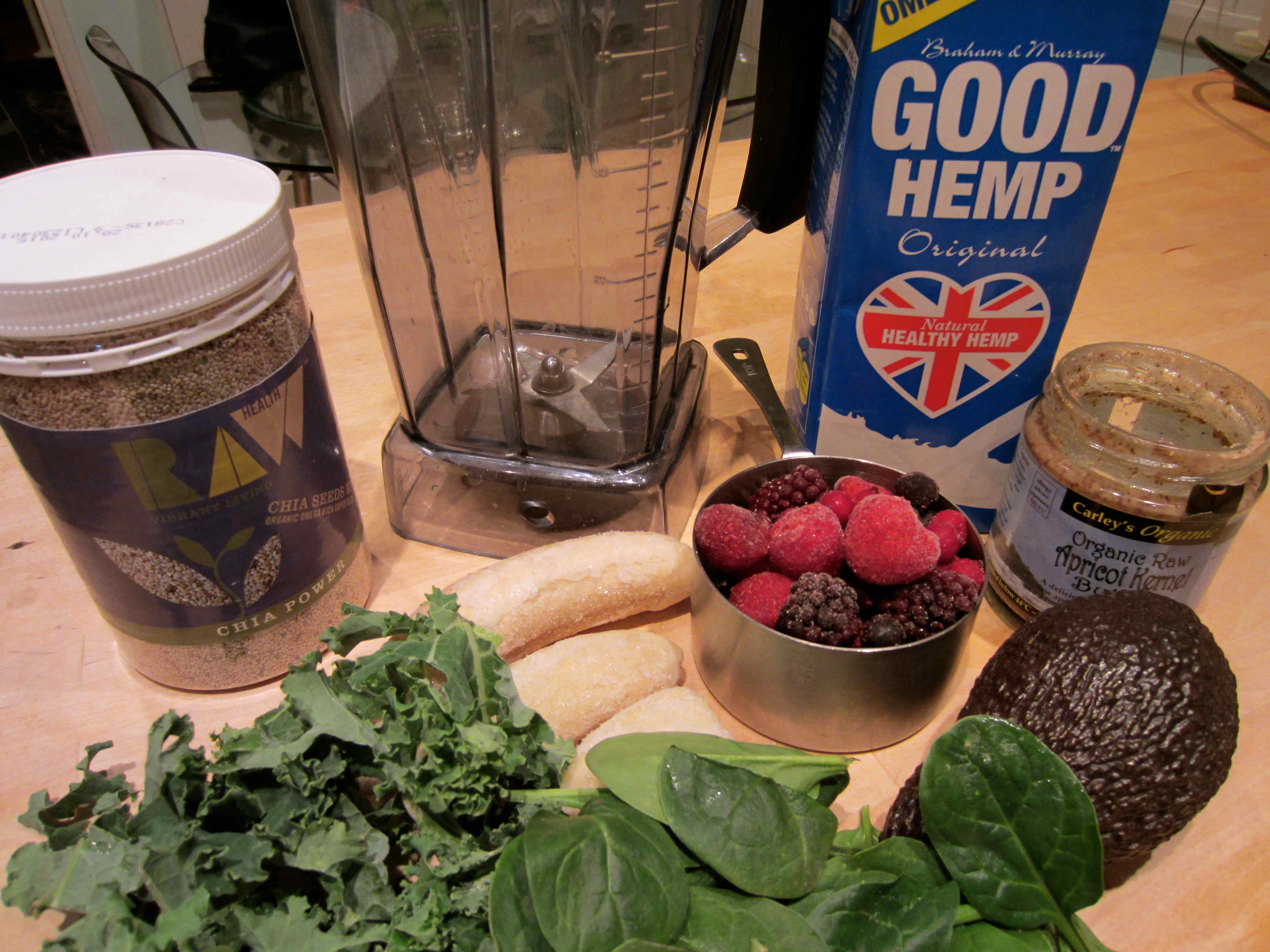 This lot once they have been through my blender; white chia seeds, hemp milk,frozen banana, frozen berries, apricot kernel and brazil nut butter, avocado, spinach and kale. This was all I had the energy to make tonight for supper. It was a bit thick and didn’t taste quite right so I tipped it back in and added 4 dates and some orange juice which made all the difference and I then really enjoyed it.