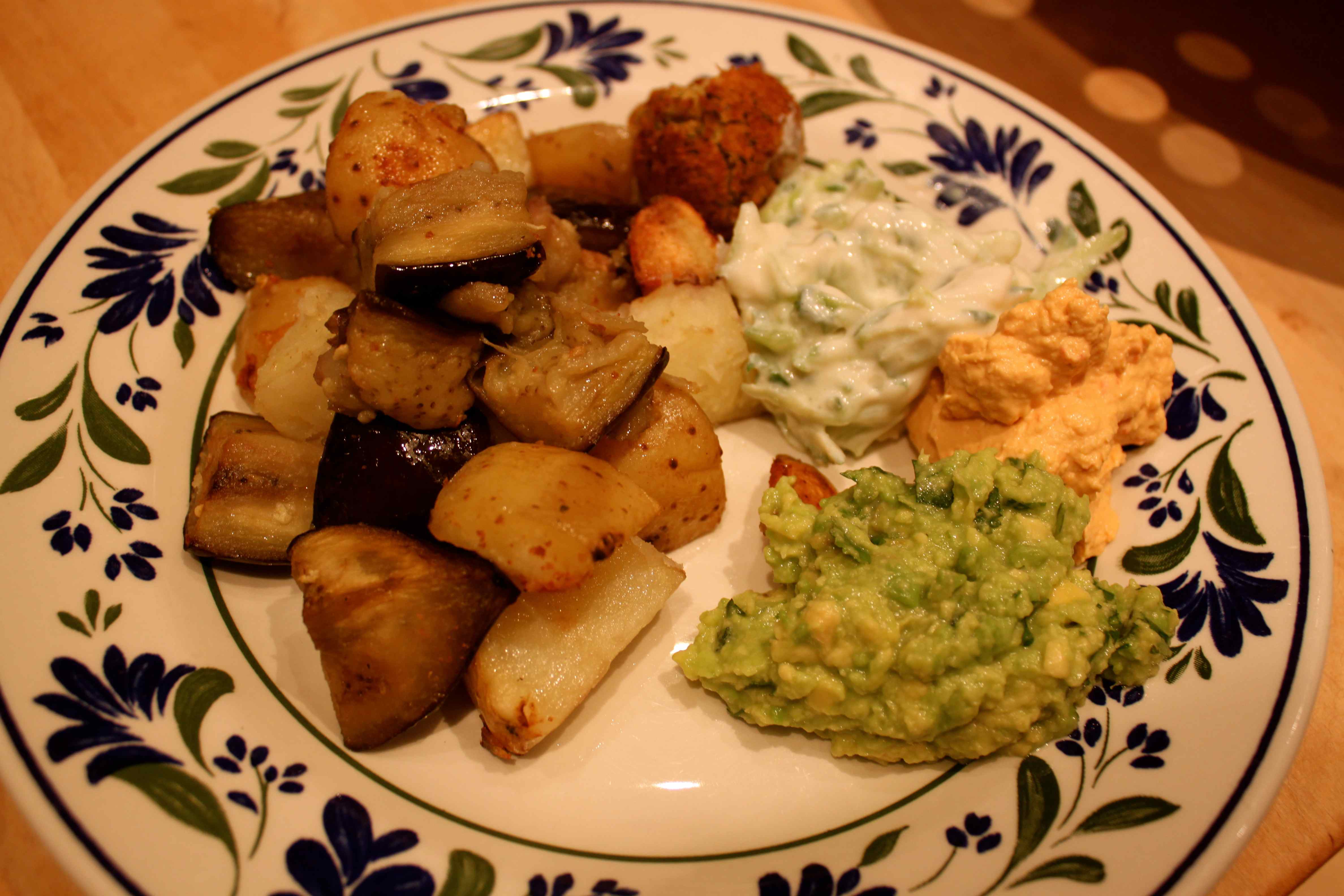I served the potatoes and aubergine with tzatziki I made with soya yogurt, cucumber, olive oil, garlic and salt and some guacamole. I used my standard guacamole recipe; 1 avocado, juice of 1 lime, finely chopped coriander and salt. I also served some humous which came with roasted red peppers in it plus I had 1 falafel as there was an open packet which needed to be finished.