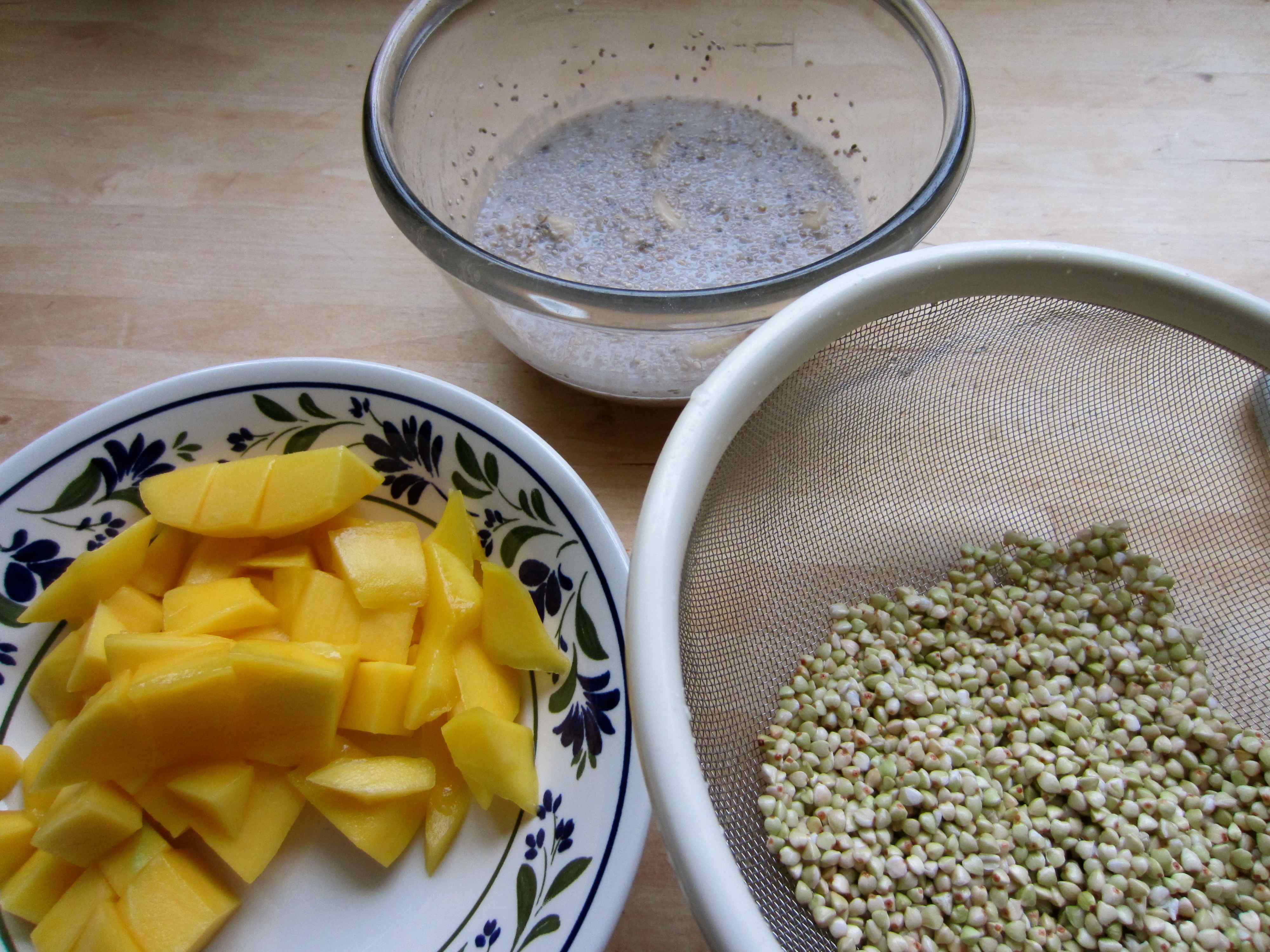 Breakfast this morning required a little assembly. In the clear bowl is a banana, half of which was mashed and the other half cut in to small chunks. That was mixed with 150 ml hemp seed milk and 15 g white chia seeds and left over night. So by morning it was thick and almost set; it had the consistency of a thick yogurt. In the sieve is 150 g raw buckwheat groats which were soaked in water overnight and then rinsed. In the other bowl is a mango.