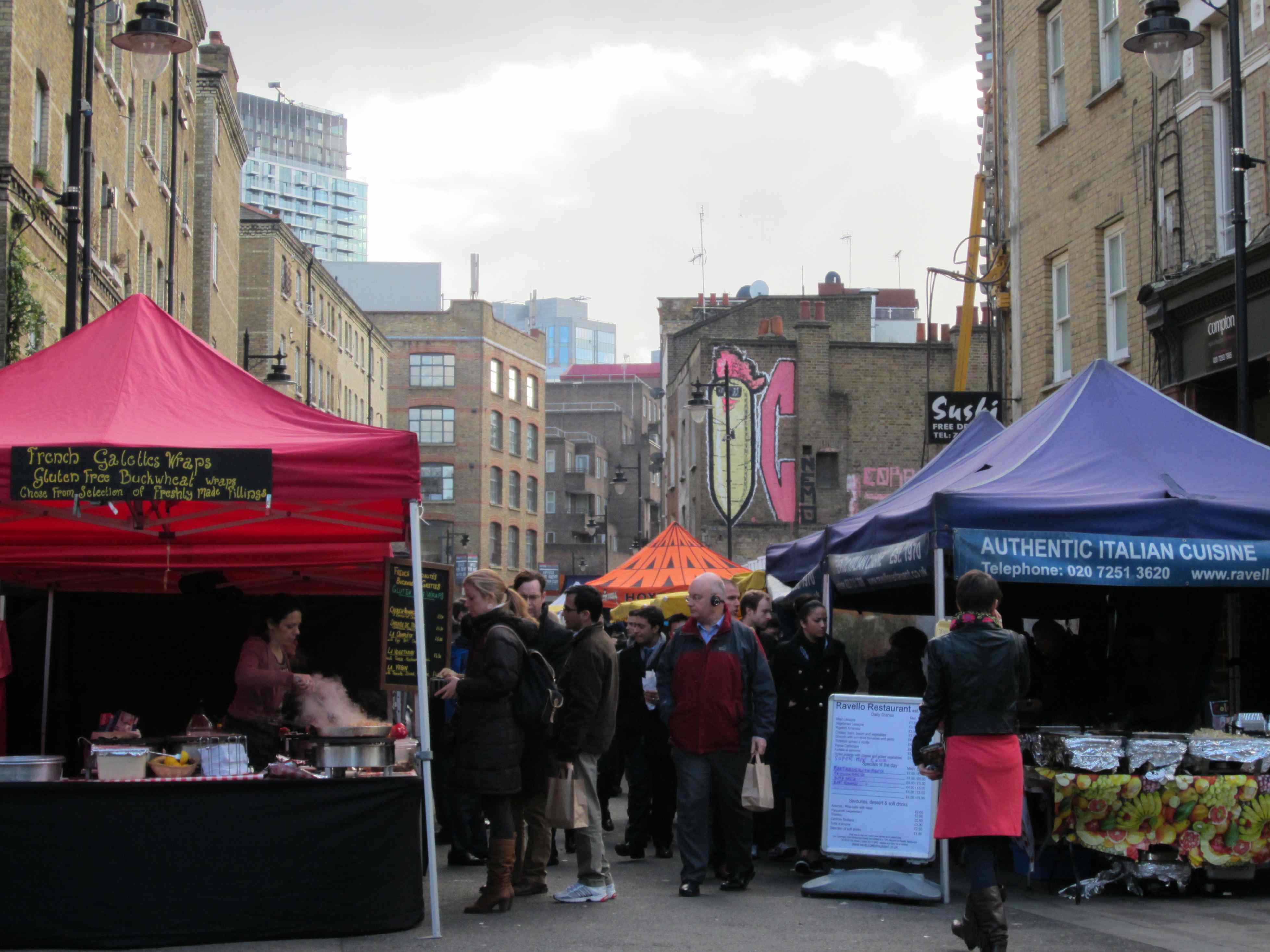 Lunch time in the International Food Market on Whitecross Street, London EC1