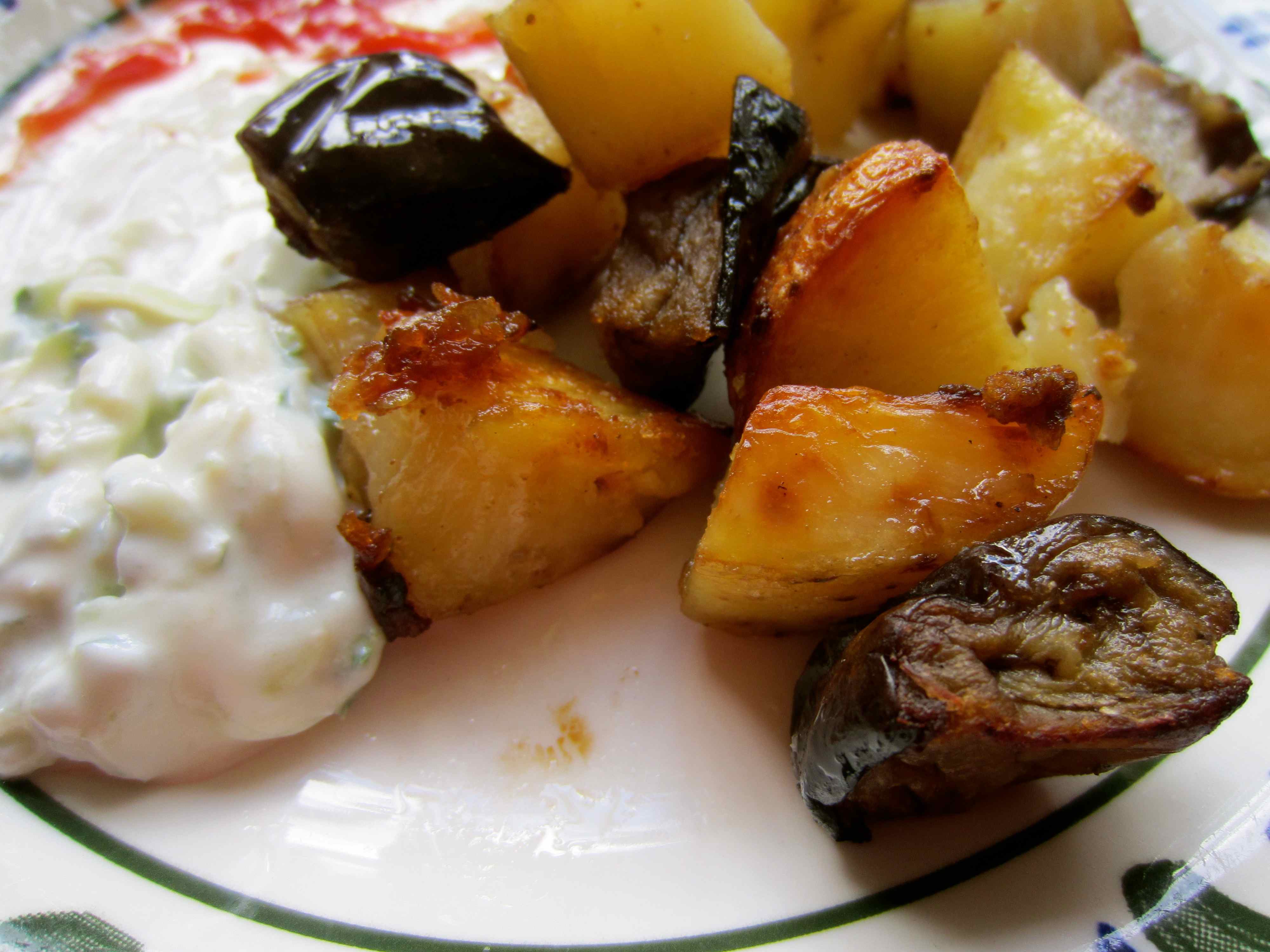 Lunch; roasted potatoes and aubergines with tzatziki and ketchup.