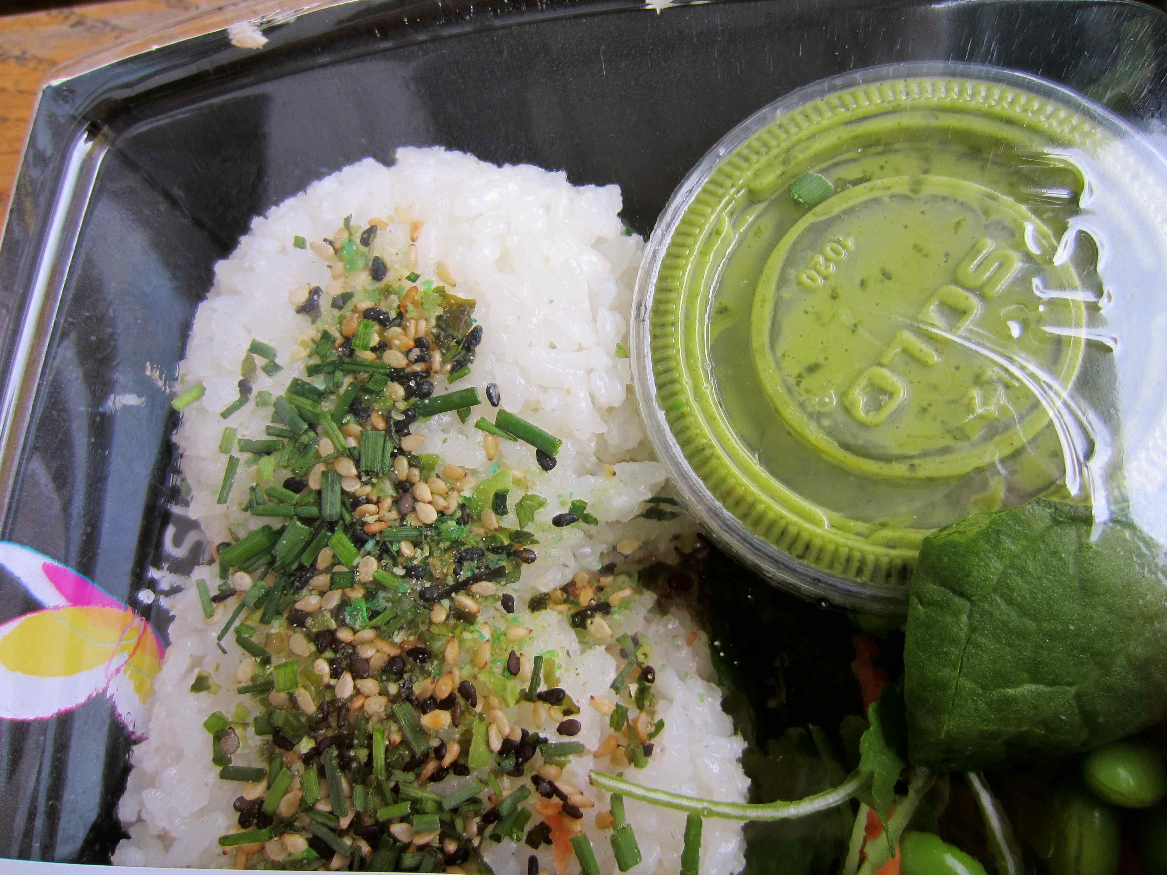 With seasoned rice and a fantastic dressing made with coriander, lime and tofu. It was exceptionally good and just under 500 calories.