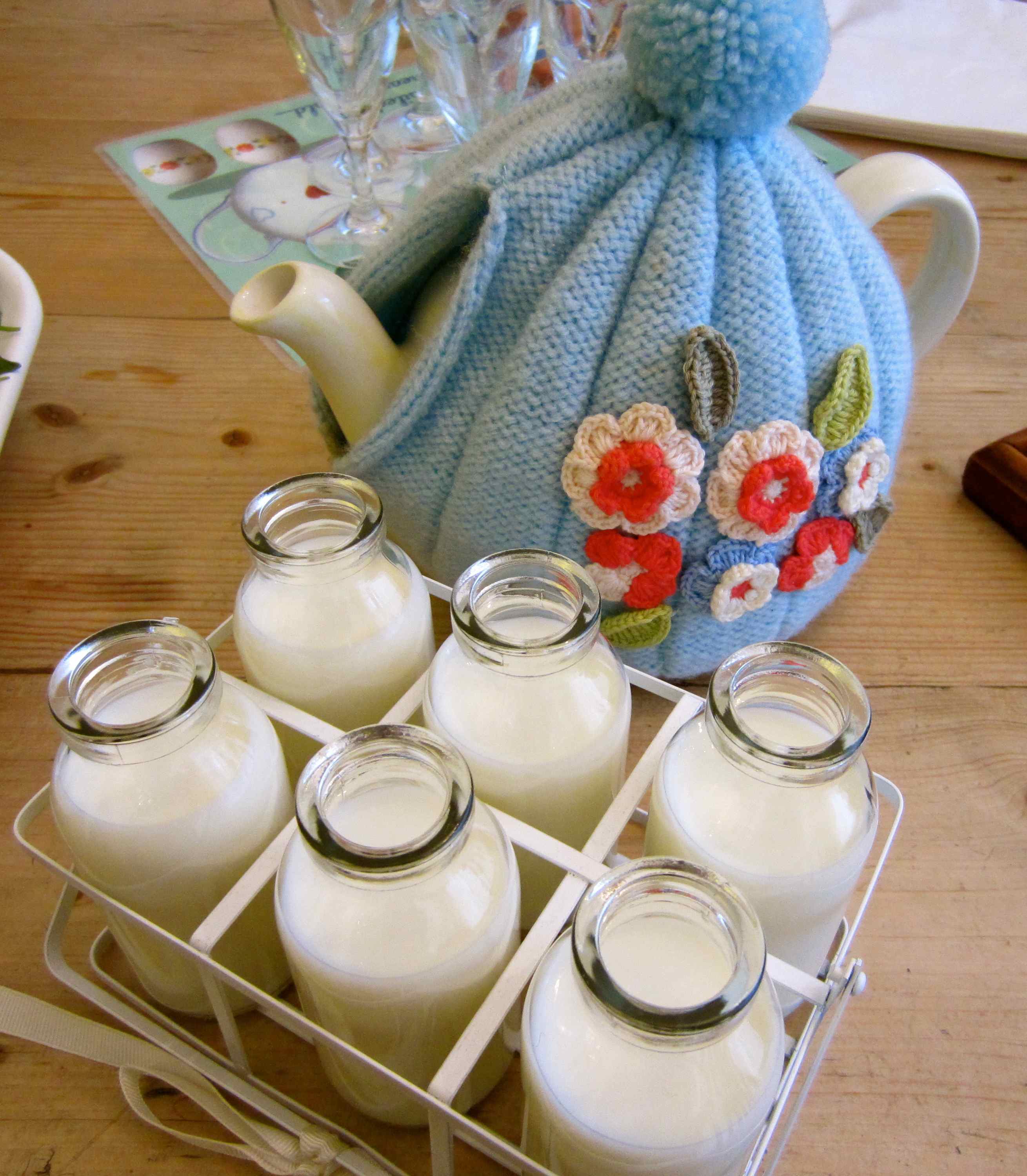 A lovely pot of tea – love the little milk bottle jugs.
